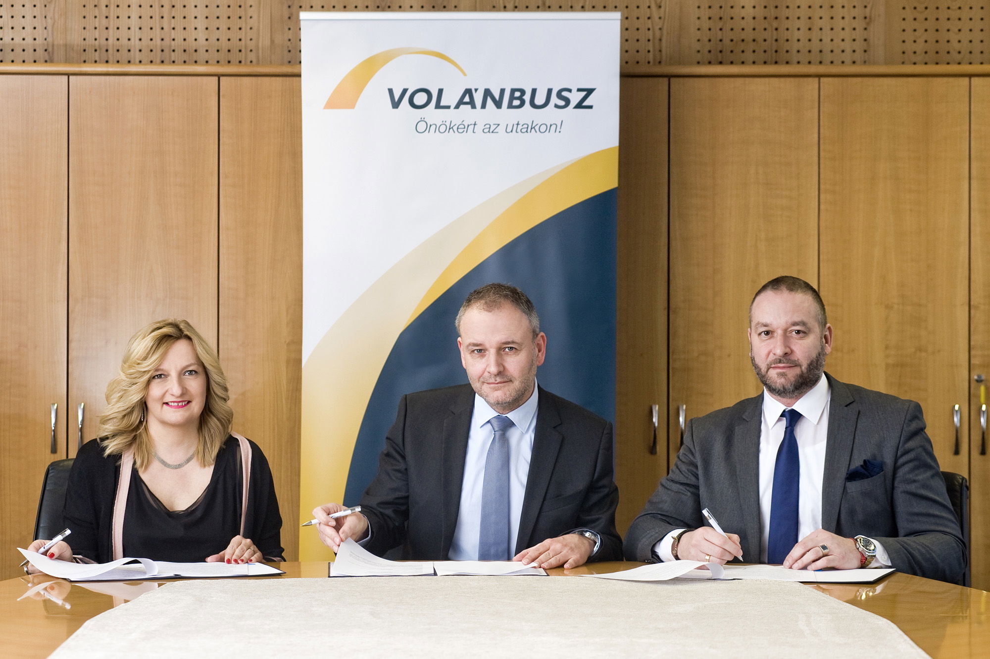 Az aláírás pillanata: Dávid Ilona, a Volánbusz Zrt. elnök-vezérigazgatója, Martin Strier, az MAN Kamion és Busz Kereskedelmi Kft. ügyvezető igazgatója és Hoyos György Sándor, utóbbi cég buszüzletág-igazgatója