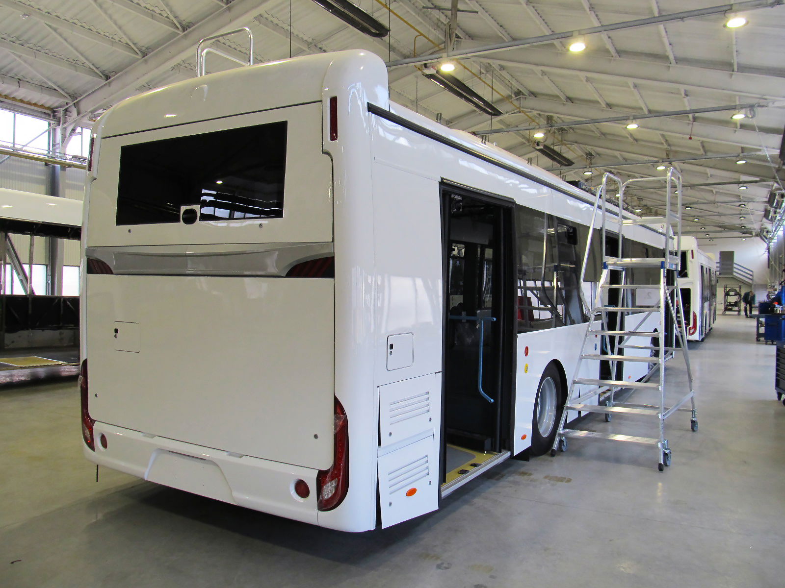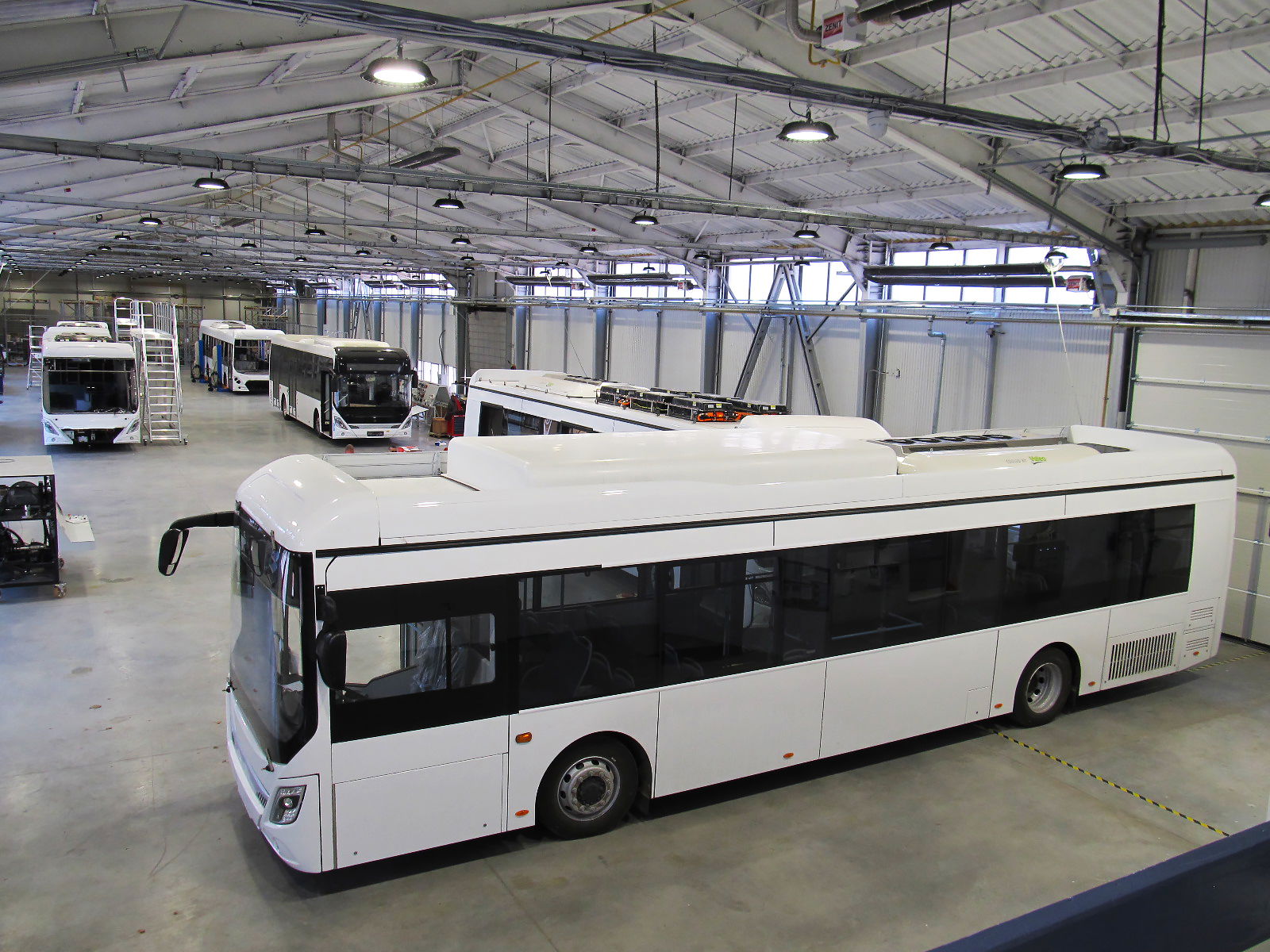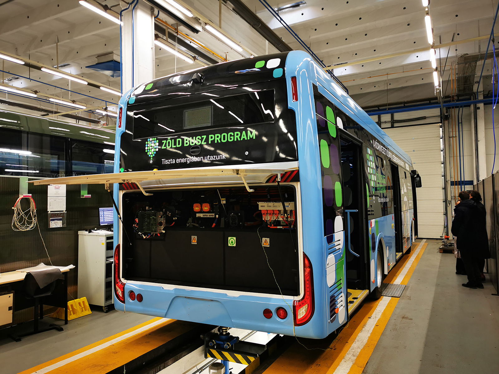 Az elektromos hajtású buszok villamossági szerelőcsarnoka – a kép jobb oldalán a még Kínából származó legelső demóbusz látható