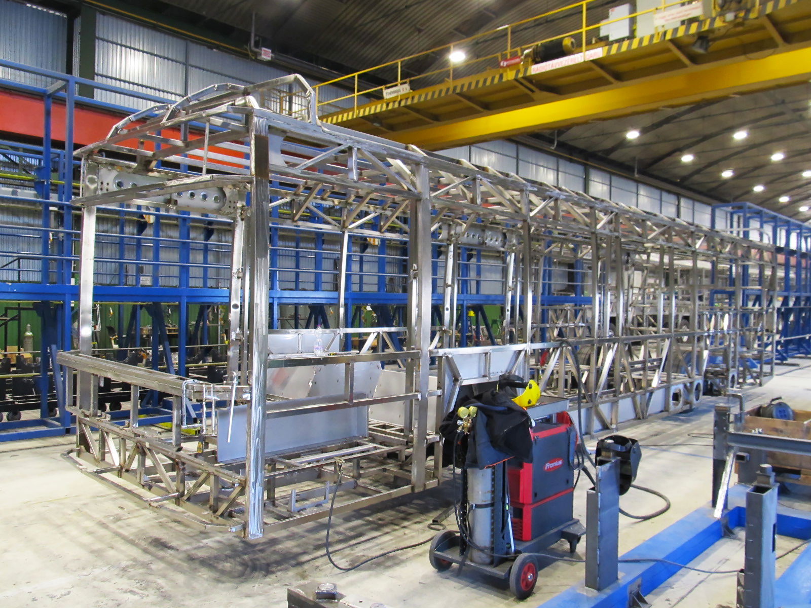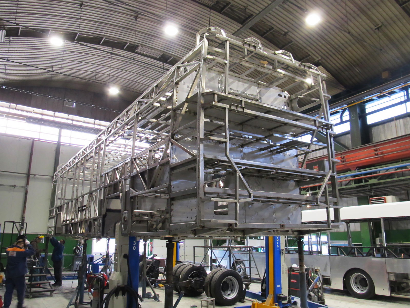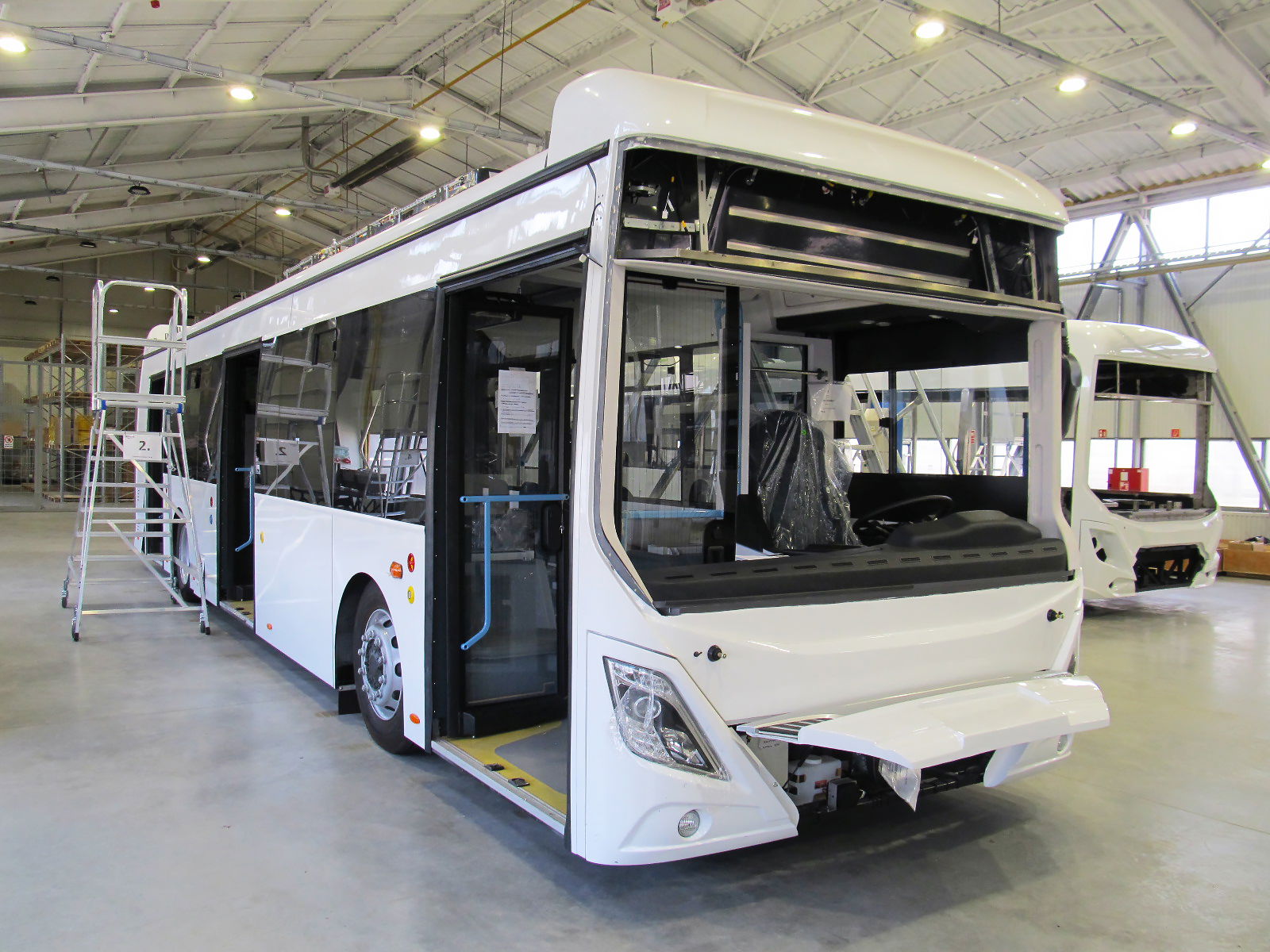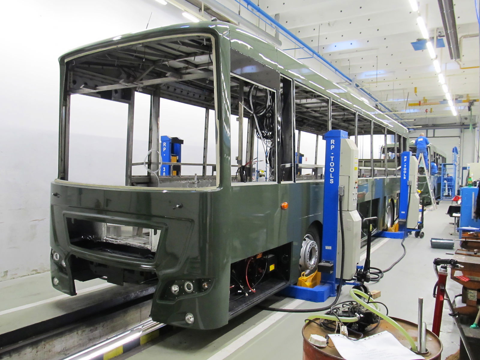 A buszgyártás jelenleg három nagyobb csarnokban zajlik a székesfehérvári Ikarus Ipari Parkban, nem számítva a kisebb alkatrészeket előállító épületeket, valamint az elkülönített fényező-, illetve esőztető kamrát. A fő objektumok közül kettőt már a legutóbbi, múlt tavasszal tett látogatásunk során megtekinthettünk. A vázas- és lemezes munkákat végző üzemben azóta kissé változtattak az egyes munkaállomások elhelyezkedésén: az oldal-, tető- és fenékvázak hegesztőkészülékeit áthelyezték a szomszédos csarnokrészbe, a karosszériákat pedig immár két nagyméretű vázállító készülékben hegesztik össze a helyben gyártott vázelemekből. Ez lehetővé teszi két különböző busztípus vázszerkezetének azonos időben történő gyártását, egymással párhuzamosan.