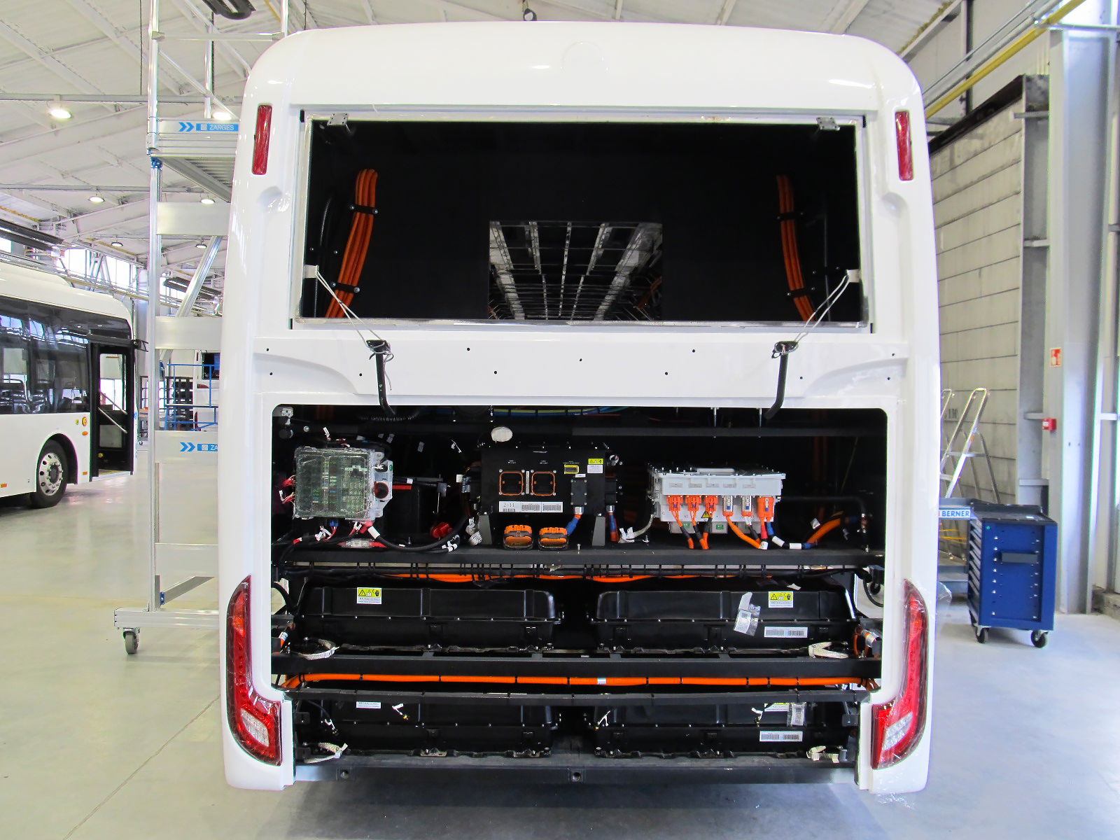 Alul keresztben a busz végében elhelyezett négy akkumulátor, felette a teljesítményelektronika részegységei láthatók