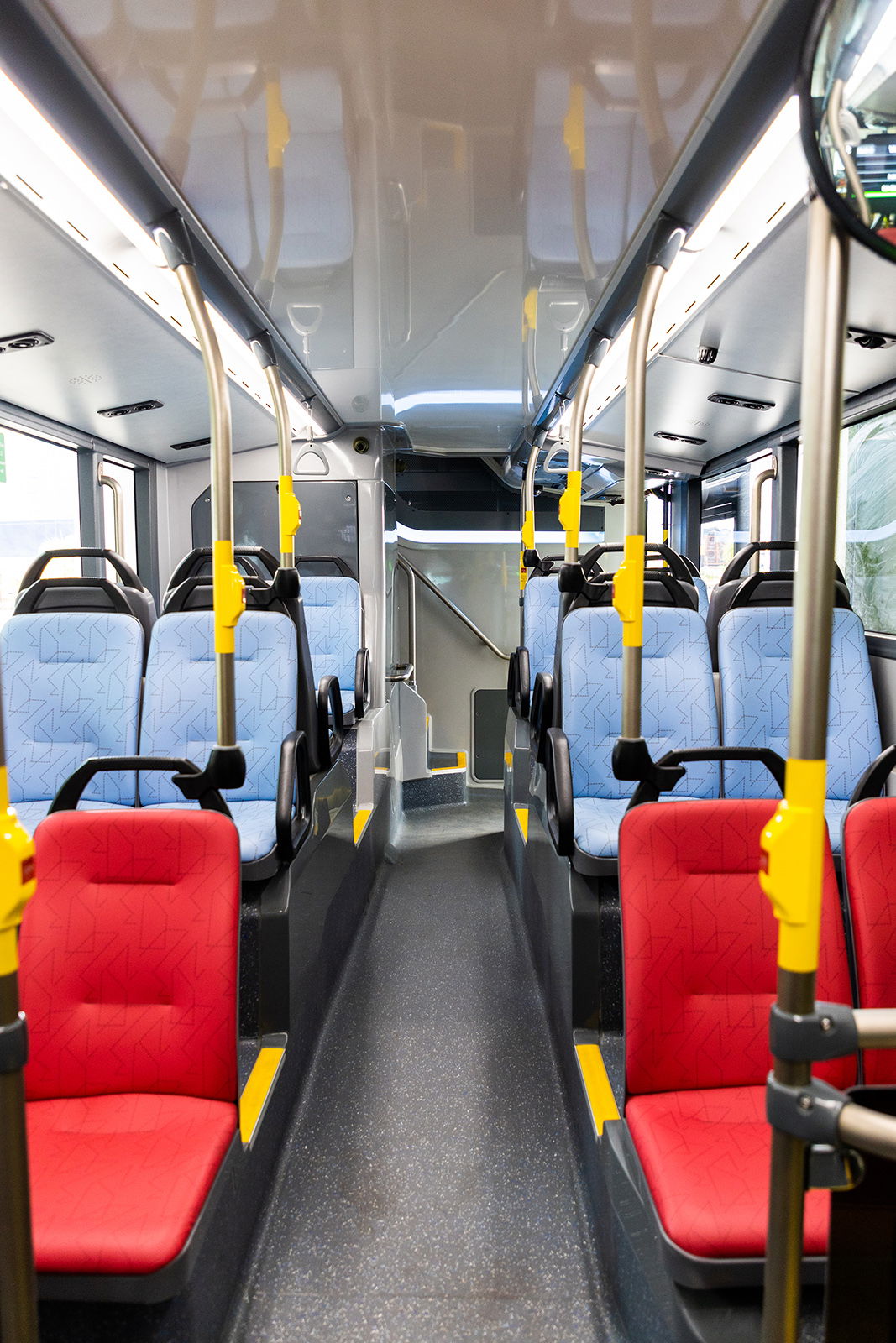 Pillantás a második ajtó vonalából a busz végébe. A piros kárpitozás az elsőbbségi utasüléseket jelöli