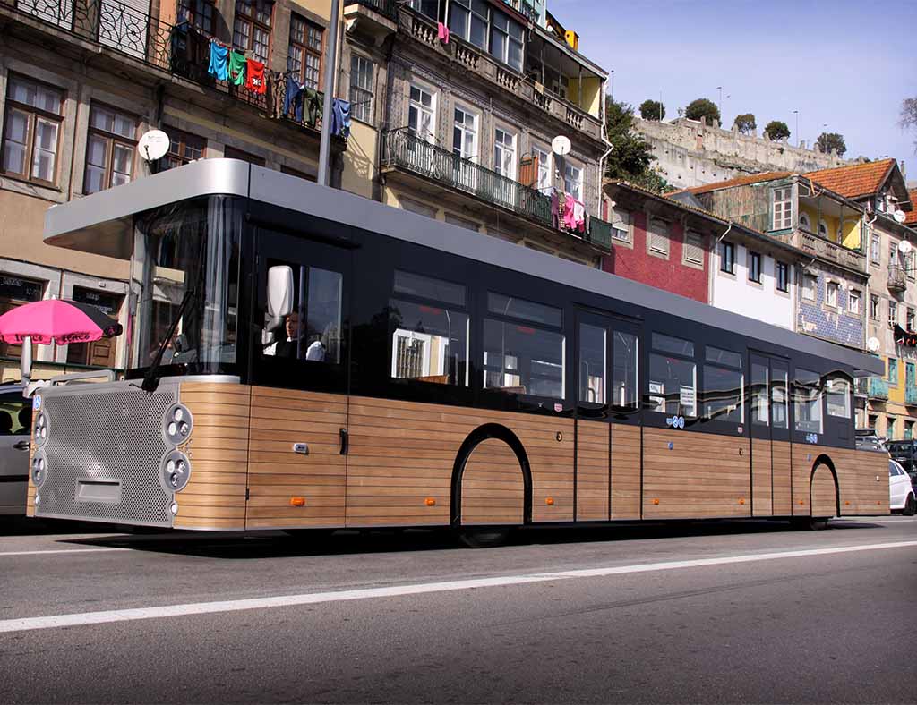 A különleges műszaki tartalomhoz persze exkluzív külső design is jár, ami túlzásba vitt modernitás helyett inkább sajátos stílusával hívja fel magára a figyelmet. A lekerekített élű téglatestet formázó karosszéria, a kerekeket is beleértve 7 mm vastag, tikfából készült külső burkolatot kapott, igaz, ez az eltelt évek alatt mostanra több példány esetében is alaposan megfakult már. Ugyanilyen hatású anyagot használtak a 14 utasülésnél is az összesen 90 fő befogadására képes alacsonypadlós beltérben, amely mindkét oldalról megközelíthető, két-két lengő-toló ajtón keresztül. Ez az alapvetően szintén reptéri buszos jellegzetesség is jól jön az útvonalat jellemző sajátos forgalmi viszonyok között. A külön ajtón át megközelíthető vezetőfülke melletti terület a busz mindkét végén nyitott, végképp szokatlan megjelenést kölcsönözve a járműnek, a pontot az i-re pedig az üvegezett napfénytető teszi fel.