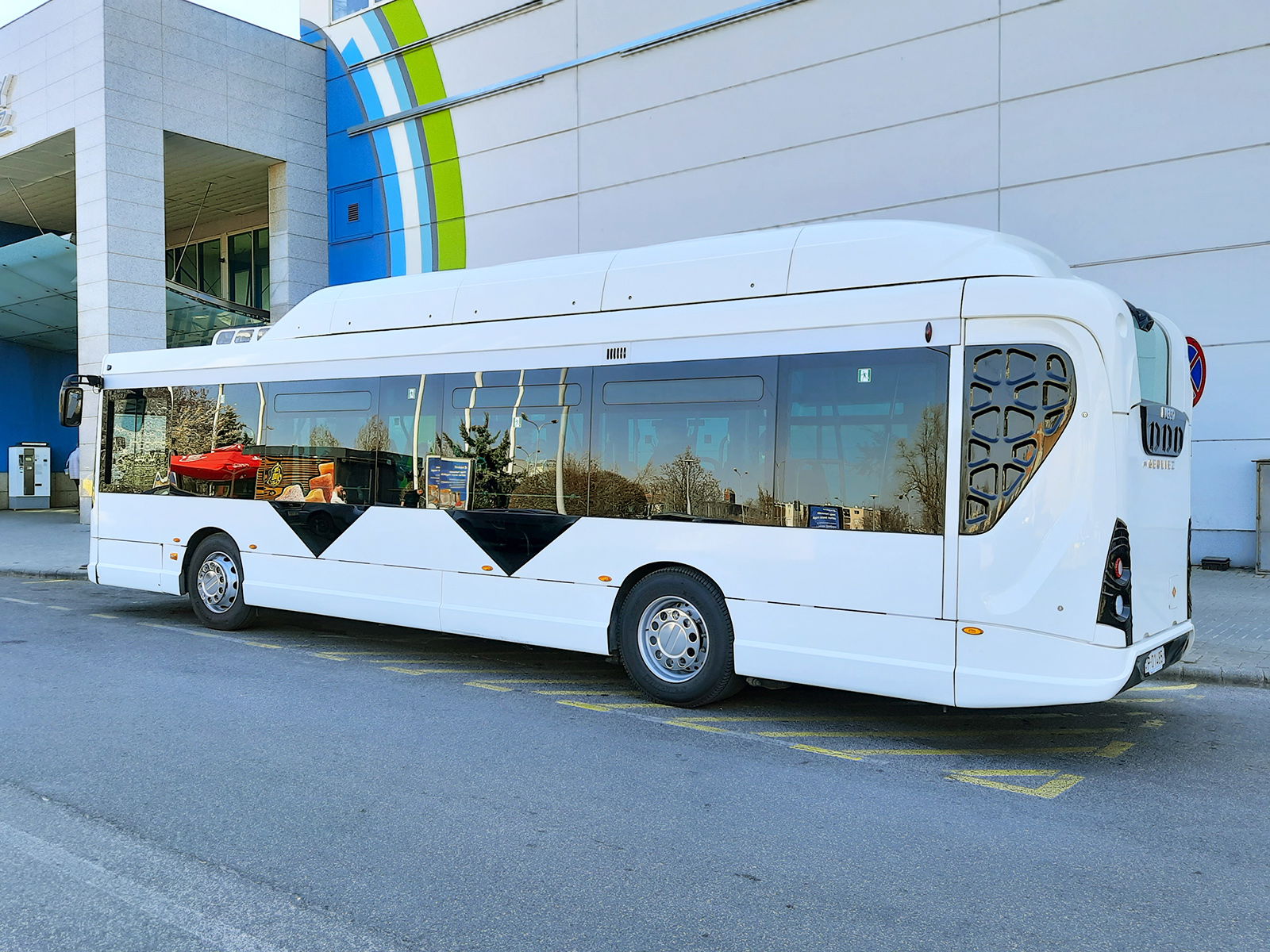 Az E-Way 10,7 méteres változatát kissé szokatlan arányok jellemzik, emiatt első ránézésre nem könnyű eldönteni, hogy teljes méretű szóló típussal, vagy éppen midibusszal van dolgunk, hiszen 10 745 mm-es hosszával a jármű éppen a két kategória határán balanszíroz. A mindössze 2350 mm-es szélesség és az ebből fakadó belső térérzet viszont egyértelműen az utóbbi irányába tolja el az egyensúlyt. Az utastérbe két darab kétszárnyú, elöl bolygó-, hátul pedig lengő-toló mechanikájú utasajtón át vezet az út – leginkább a vezetőfülke környékén érződik a karosszéria korlátozott szélessége, az eleve keskeny, befelé nyíló első utasajtó után jócskán összeszűkül a tér, amin nem segít a tűzoltókészülék kevéssé szerencsés elhelyezése sem. Visszafogott külső méretei ellenére a 10,7 méteres E-Way a típuscsalád többi tagjához hasonlóan teljes hosszban alacsonypadlós konstrukció hagyományos, 22,5″ tárcsaméretű kerekekkel (igaz, a hátsó futómű esetében némi trükközéssel, amint azt látni fogjuk), igény esetén pedig akár háromajtós kivitelben is rendelhető. A konkrét bemutatópéldány esetében Hanover Displays gyártmányú LED-es mátrixtáblákon jeleníthető meg a viszonylatszám és az aktuális útirány – a szokásos módon a homlokfalon és a jobboldali egységen ezek mindegyike olvasható, hátul pedig egy kis méretű, csak a járatszám kiírására szolgáló kijelző került beépítésre.