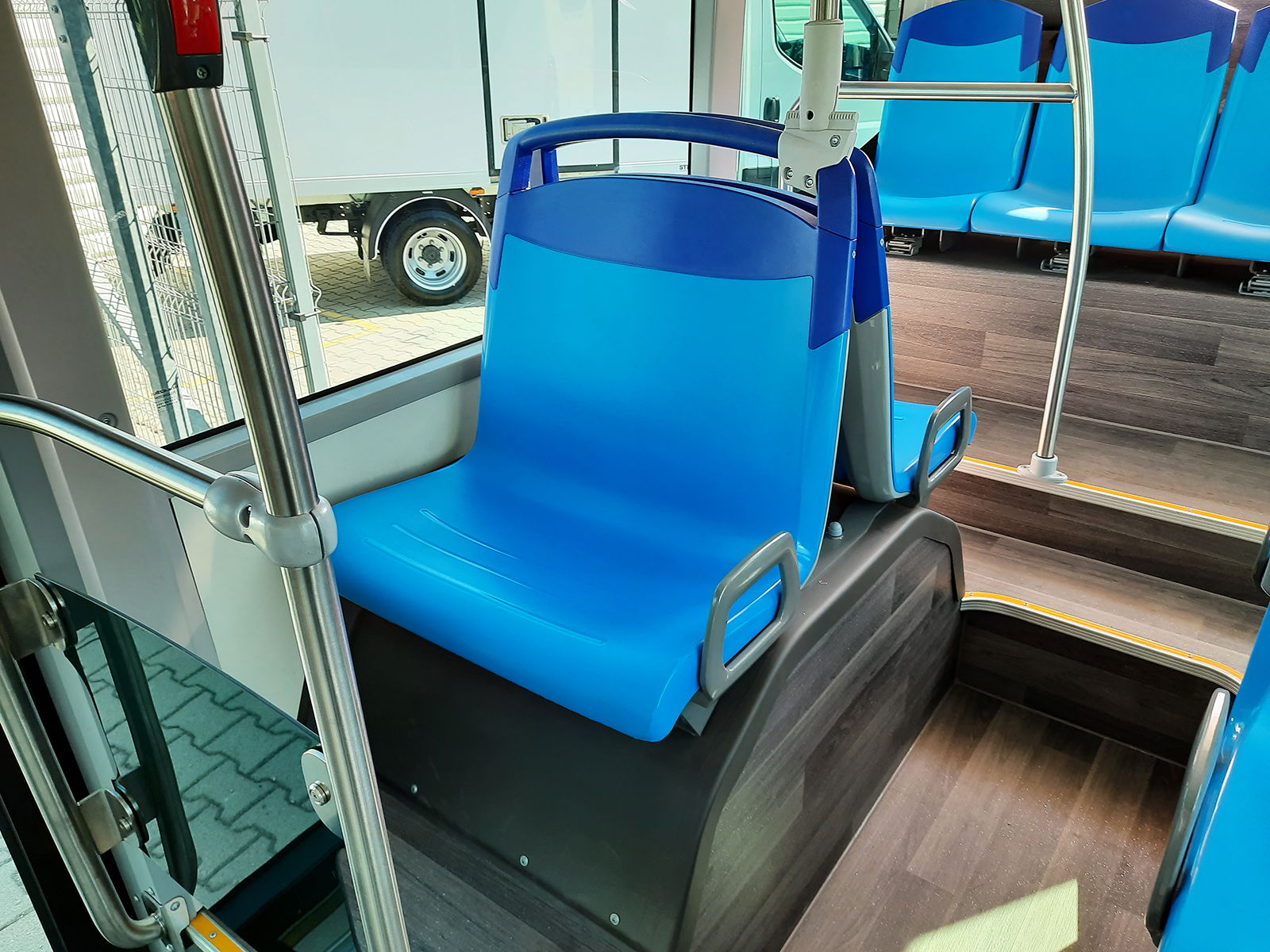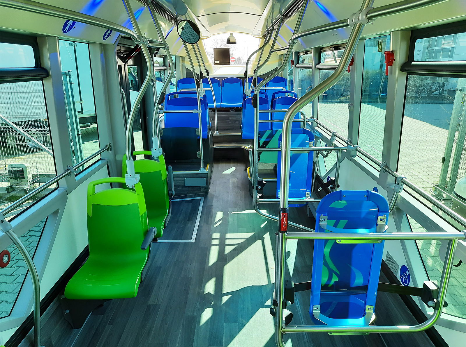 A beltérben több szokatlan megoldással is találkozhatunk, ilyenek például a jobb hátsó kerékdobon elhelyezett másfeles ülések. A kapaszkodók vonalvezetése és helyenként elhelyezése is sajátos, a peronrészen a függőleges kapaszkodók a dobogómentes ülésekhez hasonlóan az oldalfalhoz vannak rögzítve. A beltéri vizuális utastájékoztatást a demóbuszon a minimumra redukálták, nem maradtak viszont el a manapság már szinte elengedhetetlen USB-töltőpontok az utazóközönség mobil eszközei számára – ezeket az E-Way esetében az ablakoszlopokon helyezik el. A baloldalt három, jobboldalt két nyitható ablakfelület elhúzható helyett csak kibillenthető kivitelű, de nagyobb melegben természetesen a légkondicionáló is rendelkezésre áll.