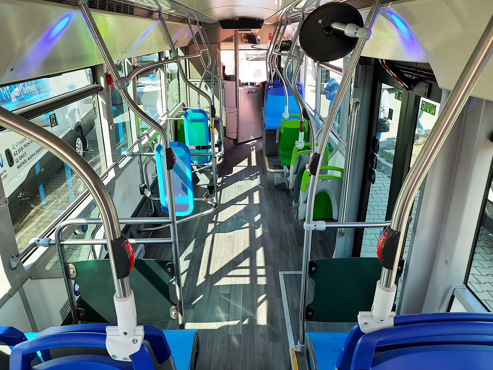 Felszereltség szempontjából a demóbusz a spórolás és a presztízsmegoldások érdekes kombinációja, hiszen míg például a ködlámpák hiányoznak a homlokfalról, a részben üvegezett peronrész megcsillant valamit az Heuliez buszaira jellemző extravaganciából. Az utasteret vidám színek uralják, a padlószinten elhelyezett négy elsőbbségi utasülés élénkzöld, a többi pedig kék árnyalatot kapott, a kapaszkodókba rejtett kék hangulatvilágítás is tetszetős. A fedélzeten 17 darab ISRI CityLine típusú párnázatlan utasülést helyeztek el, ezek alakjuk és keménységük miatt legfeljebb rövid távra kényelmesek igazán. Az állóhelyek száma a gyári tábla szerint 56, kerekesszékes-férőhelyből pedig mindjárt kettőt is kialakítottak a peronrészen, biztonsági övvel és kihajtható védőkorláttal ellátva. Magasabb árfekvésű típusról lévén szó, a mozgáskorlátozottak közlekedését a második ajtónál elektromos működtetésű rámpa segíti, amelyet a Masats szállít.