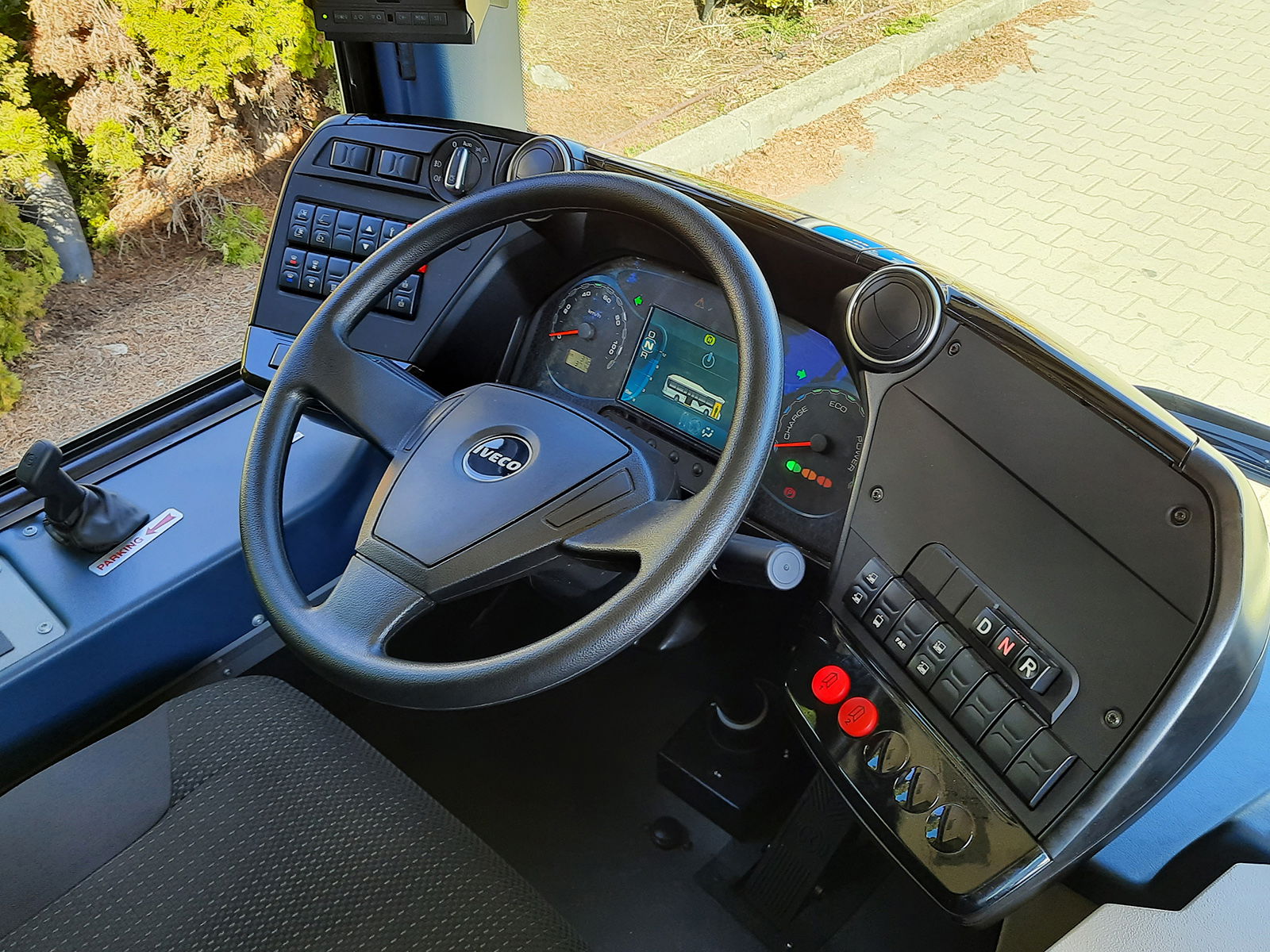 A járművezető az Ikarus villanybuszaiból is ismert masszív, jól áttekinthető ACTIA Podium 2 típusú műszerfal mögött foglal helyet, az Heuliez modelljeire jellemző módon kifejezetten magas üléspozícióban. Az elsősegélydoboz, illetve az utastájékoztató rendszer és a rádió kezelőszerveinek elhelyezése sem teljesen szokványos, előbbi a pilóta a feje mögött, utóbbiak pedig a szélvédő feletti keresztcsatornán találhatók. Klasszikus értelemben vett retarder nincs a buszban, a lassítófék funkció viszont nem hiányzik, sőt, az ennek szerepét ellátó regeneratív fékezés háromféleképpen is aktiválható: mindenekelőtt „egypedálos módban” a gázpedál felengedésével, de a fékpedál lenyomásakor is a pedálút első részében valójában a villanymotor generátoros üzemmódja lép működésbe a pneumatikus üzemi fék helyett. Végezetül pedig ott a kormánykeréktől jobbra elhelyezett, három erősségi fokozatba állítható kézi működtetésű elektromos fékkar is, amellyel a jármű akár teljesen állóra is fékezhető.