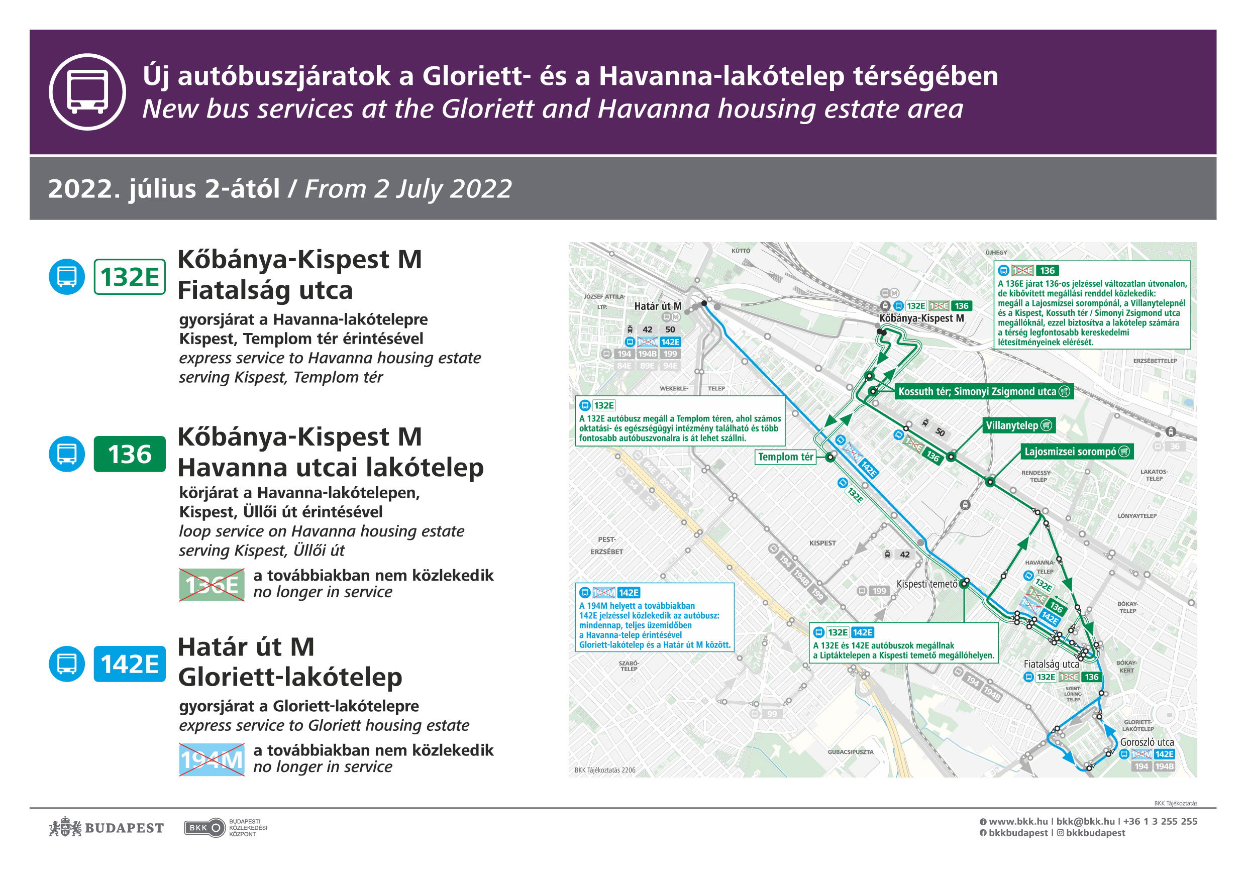 Az eddigi 136E buszjárat 136-os jelzéssel közlekedik július 2-ától, és az eddiginél több megállóban állnak majd meg a járművek: a Lajosmizsei sorompónál, a Villanytelepnél, a Kossuth téren, illetve a Simonyi Zsigmond utcai megállót is érinti a járat. A BKK elmondása szerint figyelembe vette a társadalmi egyeztetésen tett észrevételeket, hogy a Havanna-lakótelepről még több kereskedelmi létesítmény legyen elérhető az Üllői úton. A társaság a Havanna-lakótelepről gyorsan Kőbánya-Kispestre közlekedőknek az új 132E járatot ajánlja.