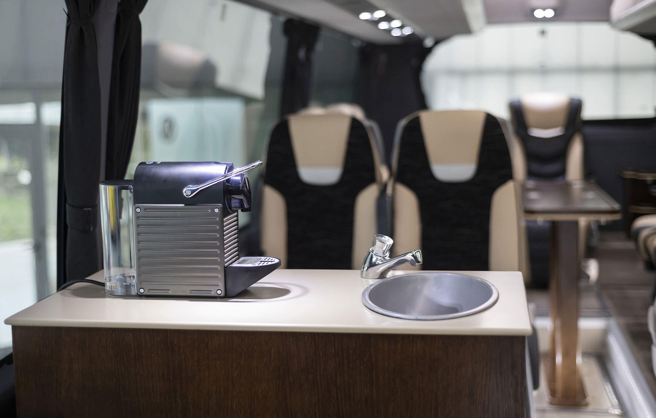 A 12,2 méter hosszú kéttengelyes luxusbusz utasterének berendezését a megrendelő kuvaiti tűzoltóság (Kuwait Fire Force) egyéni kívánságai szerint alakították ki, a fedélzeten tartózkodók kényelmét messzemenőkig szem előtt tartva. A felszereltség részét képezik többek között Corian felülettel rendelkező, fából készült asztalok, a hűtőszekrénnyel, kávéfőzővel és kézmosóval ellátott étkezőrész, a zuhanyfülke, valamint a minden utasülésnél megtalálható USB-töltőcsatlakozók, amelyek mellett számos 220 V-os aljzatot is elhelyeztek a fedélzeten a laptopok számára. A második ajtó vonala előtt található, menetirányba néző, növelt lábterű utasüléseket felhajtható, többállású lábtámasszal is ellátták, a jármű végében kialakított tárgyalóhelyiségben pedig hét, fotelnek is beillő ülőalkalmatosságot helyeztek el, amelyek egy pohártartókkal kiegészített tárgyalóasztalt vesznek körül.
