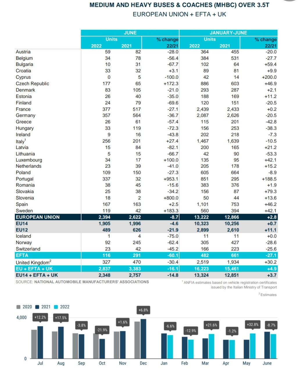 Az Európai Autógyártók Szövetsége (ACEA) a napokban közzétette legfrissebb, a 2022 első félévére vonatkozó jelentését a városi, helyközi és különjárati szektorban újonnan regisztrált, 3,5 tonna feletti össztömegű autóbuszok eladásainak alakulásáról Európában. A beszámoló szerint, az Európai Unió 27 tagországában, az Egyesült Királyságban valamint az Európai Szabadkereskedelmi Társulás (EFTA) tagországaiban, azaz Izland, Norvégia és Svájc piacán az elmúlt fél évben összesen 13 324 új autóbusz talált gazdára, ami 4,9%-os növekedést jelent az előző év hasonló időszakának 12 851 darabos eladásához képest.
