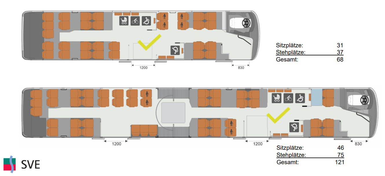 A szóló trolibuszok két-, míg a csuklósok háromajtós kialakítással érkeznek majd, elöl egy-, középen és hátul pedig kétszárnyú, kifelé nyíló lengő-toló mechanikájú utasajtókkal szerelve. A trolik fedélzetén a bal és a jobb oldalon is alakítanak ki peronrészt – utóbbi kerékpárszállításra is alkalmas lesz -, ezeken két kerekesszékes utasnak is jut hely, ők a második ajtóhoz telepített, 450 kg teherbírású rámpán át közelíthetik meg utasteret. A szóló kocsik 31 ülő és 37 álló utast tudnak majd szállítani, a csuklósokon pedig 121 fő utazhat egyidejűleg, közülük 46-an ülve, 75-en állva.