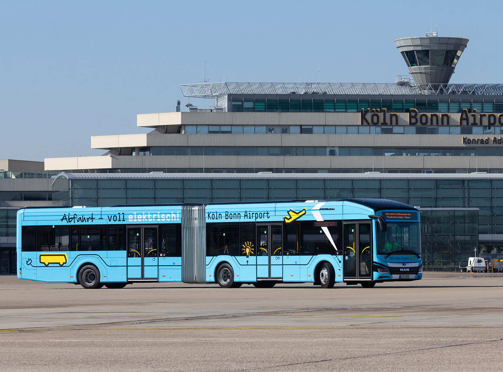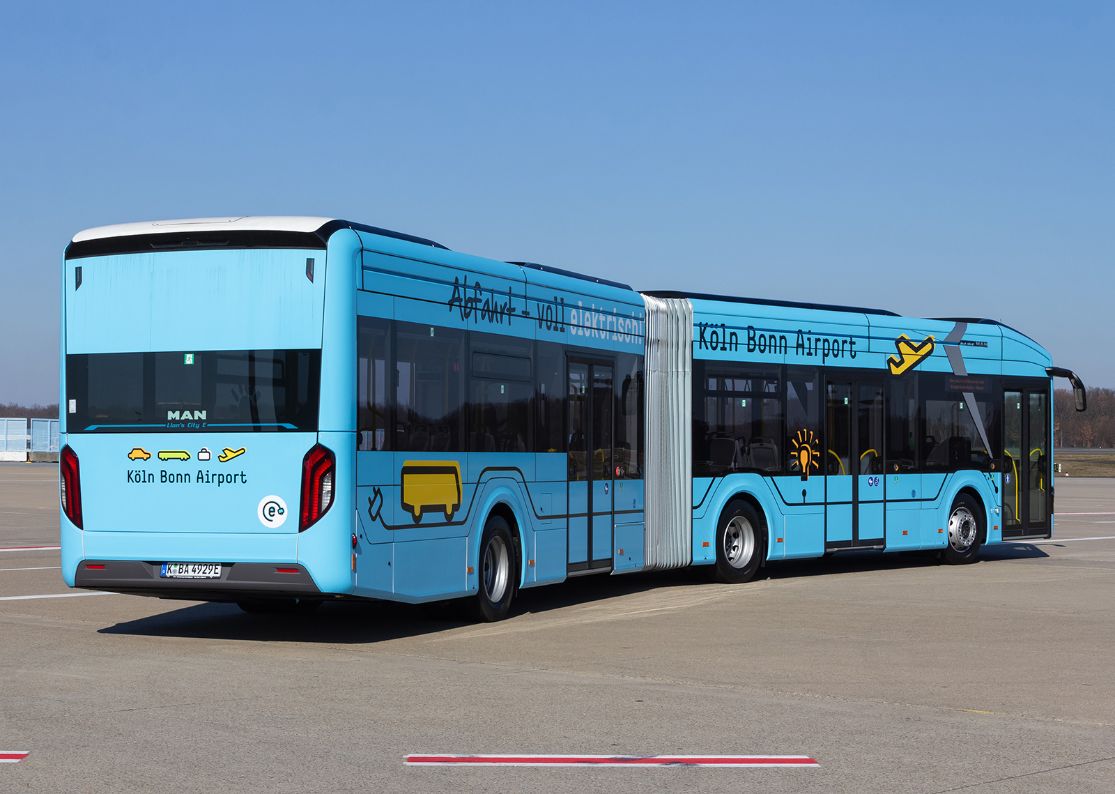 A napokban három tisztán elektromos hajtású MAN Lion’s City 18 E csuklós autóbusz kezdte meg szolgálatát a Köln-Bonn nemzetközi repülőtéren. Az új villanybuszokkal együtt hét darab lágyhibrid hajtásrendszerű MAN Lion’s City 18 EfficientHybrid csuklós is forgalomba állt, ezek néhány hete már közlekednek a légikikötő betonján.