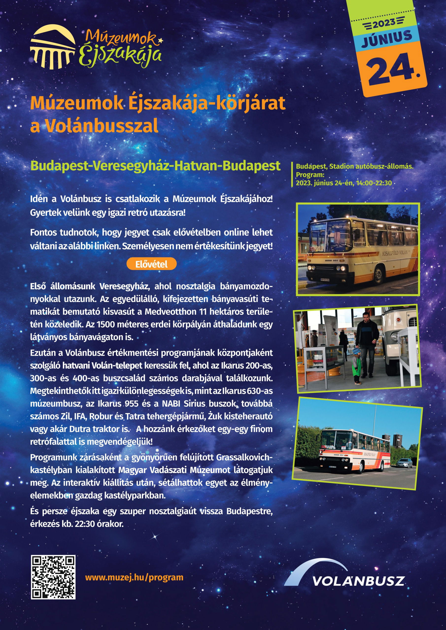 Idén 18 településen 19 helyszínnel csatlakozott a MÁV-Volán-csoport a Múzeumok Éjszakája rendezvénysorozathoz, amelyet június 24-én rendeznek országszerte. A Volánbusz egy szombat esti barangolásra várja a nosztalgiázni vágyókat Budapest-Veresegyház-Hatvan-Budapest útvonalon. A retró utazáson a társaság megőrzött Ikarus 256-osa áll az érdeklődők szolgálatába, a retró érzés pedig már a buszon garantált lesz; Rába motor, „Nagyrába” híd és legendásan kényelmes Imag Székesfehérvár utasülések.