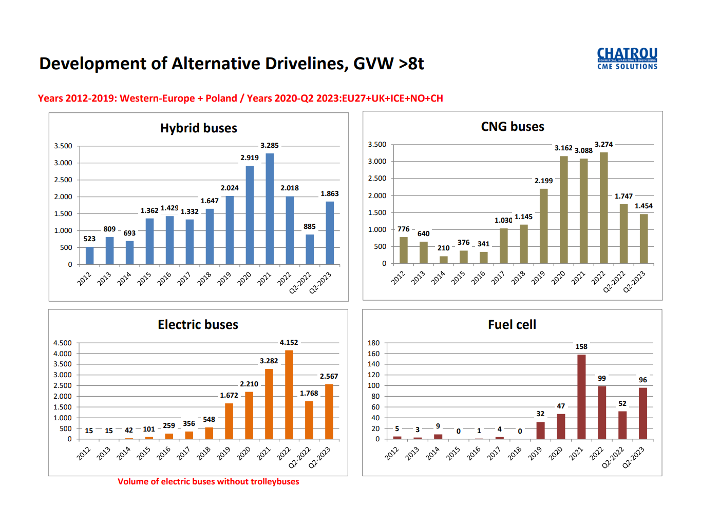 Az egyes hajtásmódok arányára vonatkozó adatok azt mutatják, hogy az európai városokban lassan, de biztosan leáldozik a hagyományos dízelmotoros típusoknak: a 2023 első felében átadott városi buszok immár 73,5%-a valamilyen alternatív hajtáslánccal rendelkezett, ami két év alatt 15%-os növekedést jelent. Ebből 37,5%-ot tettek ki a helyi károsanyag-kibocsátás szempontjából zéró emissziósnak tekinthető (akkumulátoros és/vagy hidrogénhajtású) típusok, a többin a földgázüzeműek és a tavalyi visszaesés után ismét magukra találó hibridek osztoznak. (A Chatrou CME Solutions által készített statisztikákba hagyományosan nem számolják bele a trolibuszokat.)