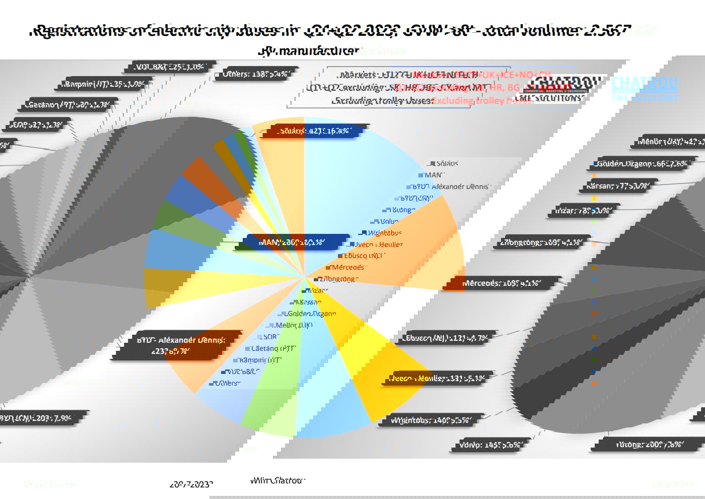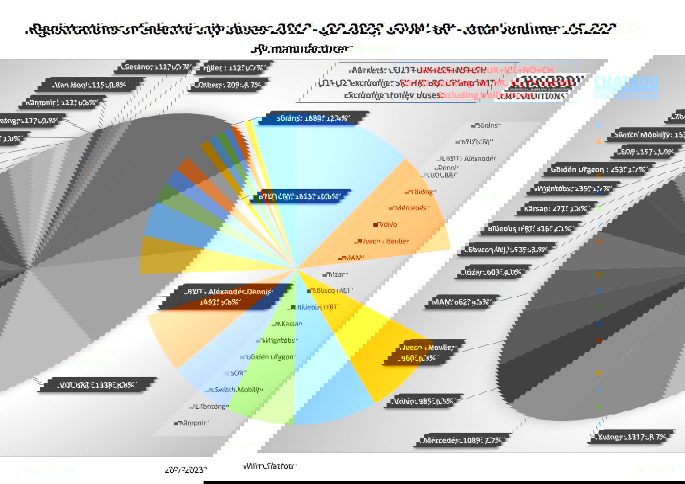 Az európai utakon közlekedő elektromos buszok összesített száma 2023 közepére átlépte a 15 ezres lélektani határt. Az elmúlt bő egy évtizedet, azaz a 2012-től és 2023 közepéig tartó időszakot nézve Európa legnépszerűbb villanybusz-gyártójának még mindig a Solaris tekinthető 1884 átadott járművel és 12,4%-os piaci részesedéssel, de csak akkor, ha különválasztjuk a BYD teljesen saját gyártású (1613 villanybusz, 10,6%-os részesedés), illetve az Alexander Dennis által karosszált (1491; 9,8%) termékeit, ellenkező esetben a kínai cégóriás felé billenne a mérleg nyelve. A VDL még egy helyet visszacsúszva is a negyedik helyen áll a korábbi jó szereplésének köszönhetően (1338; 8,8%), de az ötödik pozíciót őrző Yutong már szorosan ott van a hollandok nyomában (1317; 8,7%) – itt is felhívnánk a figyelmet az európai-kínai arány alakulására. Megemlítendő, hogy a „többiek” (others) gyűjtőnéven szereplő összesen 32 további gyártóból 12 mára beszüntette tevékenységét.