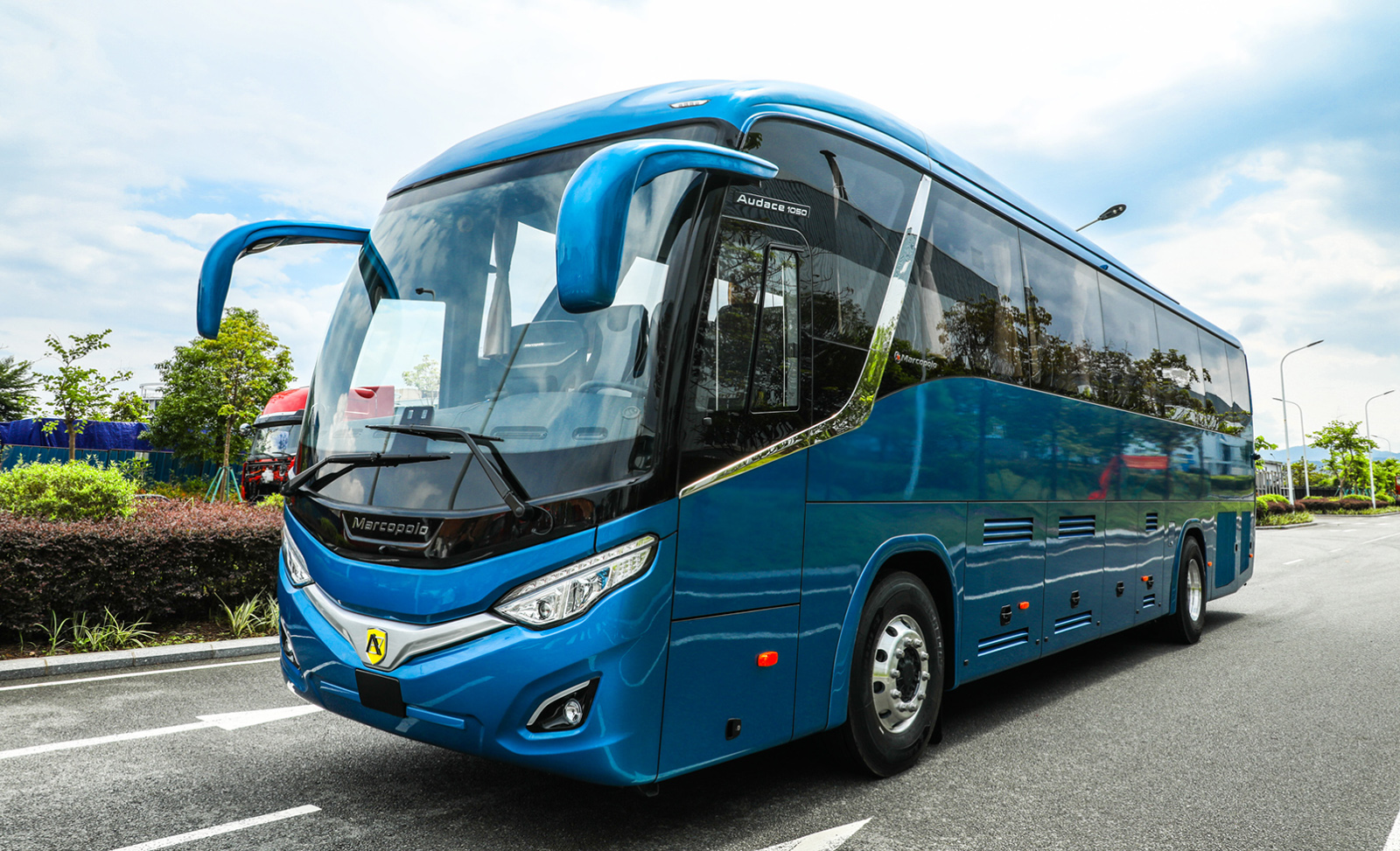 A brazil gyártó másik idei attrakciója elsősorban a hajtásrendszerével hívja fel magára a figyelmet. Az Audace távolsági busz hidrogén tüzelőanyag-cellás változatáról (Audace 1050 Fuel Cell) van szó, amely a hannoveri IAA Transportation kiállításon is szerepelt már tavaly. A jármű a Marcopolo kínai üzemében készül, és a gyártó állítása szerint minden szükséges engedéllyel és jóváhagyással rendelkezik az európai forgalmazáshoz. A műszaki alapját képező önjáró alváz a kifejezetten hidrogénhajtású haszonjármű-alvázakra szakosodott kínai Allenbus cég terméke, a két, egyenként 160 kW teljesítményű üzemanyagcella-modult pedig az ugyancsak kínai Sinosynergy szállítja. Ez utóbbiak egy CATL gyártmányú lítium-vasfoszfát (LFP) akkumulátort töltenek működésük során. Az ebben köztes jelleggel tárolt villamos energiával látja el a hajtásrendszer a busz mozgatásáért közvetlenül felelős, 140 kW állandó- és 222 kW csúcsteljesítményű, Danfoss gyártmányú állandómágneses szinkron villanymotort, amely egy négysebességes Eaton automataváltón keresztül hajtja a hátsó kerekeket. A busz legfeljebb 53 ülőhellyel szerelhető fel és akár 600 kilométert is képes megtenni egyhuzamban, a csomagtérbe telepített négy darab 350 bar üzemi nyomású Type 4-es (kompozit anyagból készült, polimer bélésű) hidrogéntartály egyszeri feltöltésével. A futóművek a ZF termékei, elöl a független felfüggesztésű ZF RL 75 E egységet, hátul pedig az inkább városi buszokból ismerős ZF AV 133 portálhidat találjuk a busz alatt.