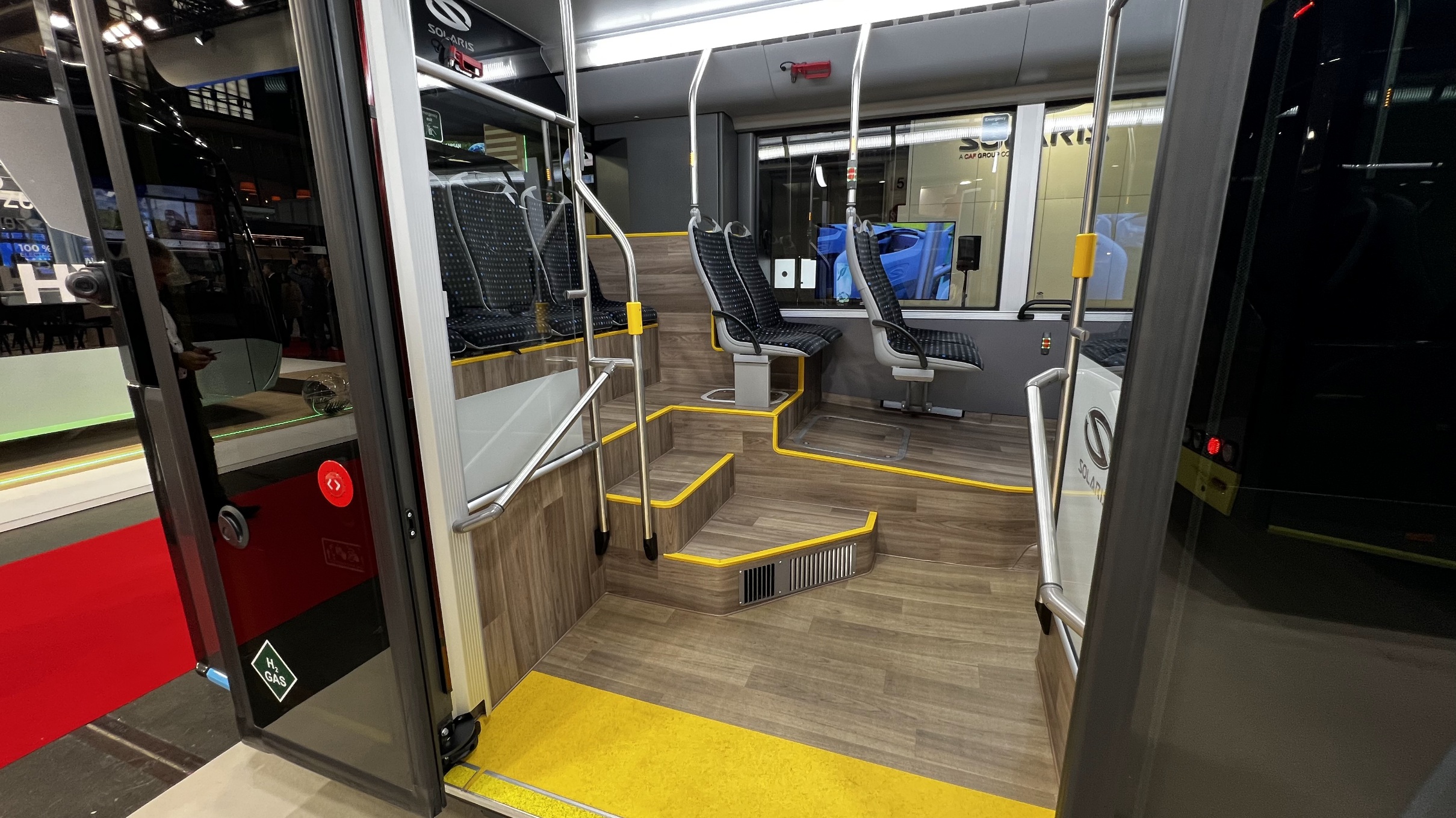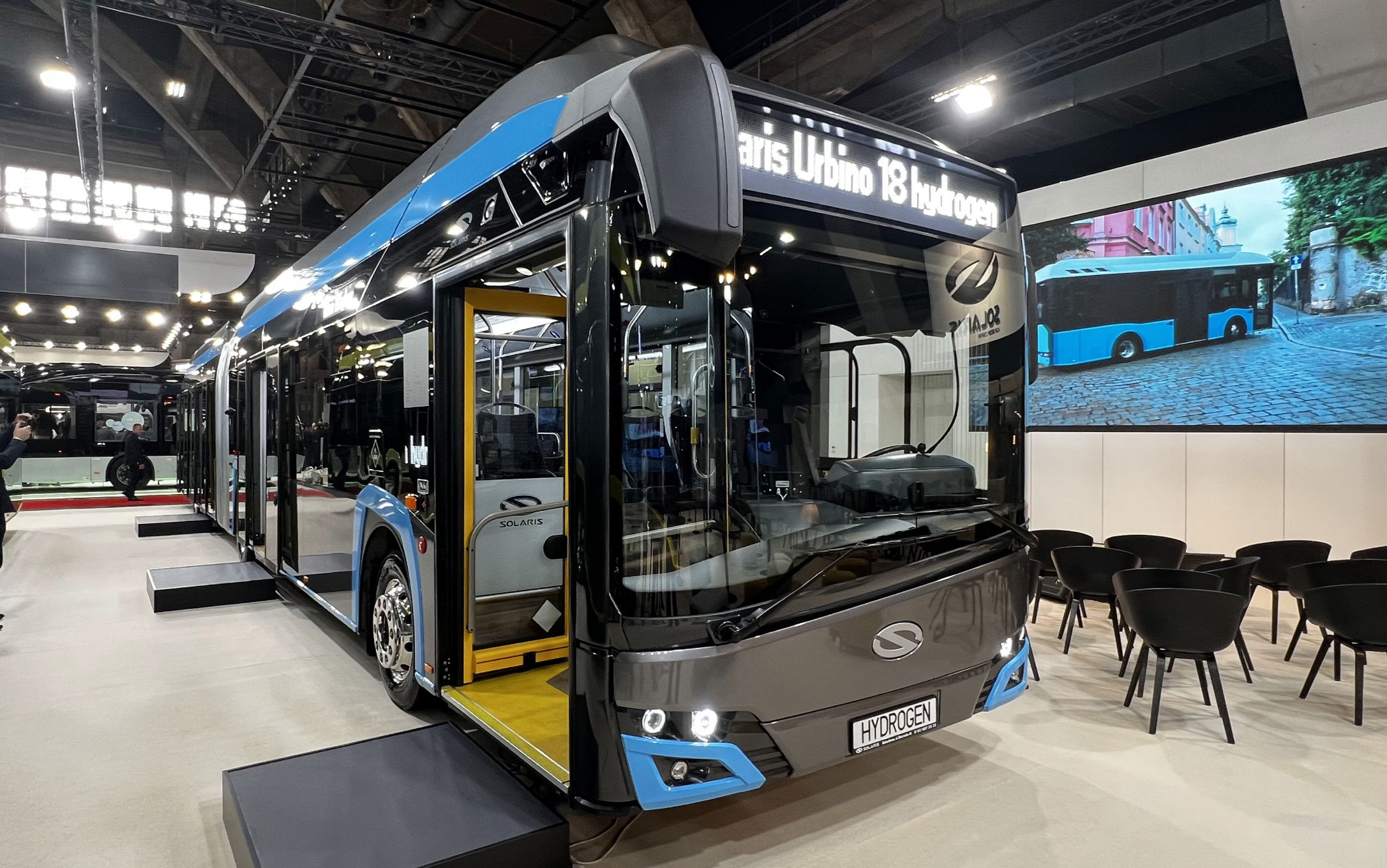 A Solaris standjának másik szereplője a tavaly bemutatott hidrogénhajtású csuklós Urbino modell egy példánya, amely piaci bevezetése óta már több, német és olasz megrendeléssel is büszkélkedhet. A járműbe egy 100 kW teljesítményű Ballard FCmove-HD+ üzemanyagcella-modul került, amelyhez közbenső tárolóként két, összesen 60,8 kWh összkapacitású lítium-titanát-oxid (LTO) akkupakk csatlakozik. Az autóbuszba egy 1560 liter össztérfogatú tartályegység került, amelyben összesen 37 kilogrammnyi hidrogén tárolható. A csuklós kivitel esetében azonban nem ez az elérhető maximális tartálykapacitás, megrendelői igény esetén ugyanis további 3, egyenként 190 literes tartály beépítésével akár 51 kilogramm hidrogén is eltárolható az Urbino 18 Hydrogen fedélzetén. A 8 palackos tartályegységgel szerelt változat esetén a Solaris csuklós hidrogénbuszának hatótávolsága a SORT 2 mérések alapján elérheti a 600 kilométert is. A típusról részletesen itt írtunk.