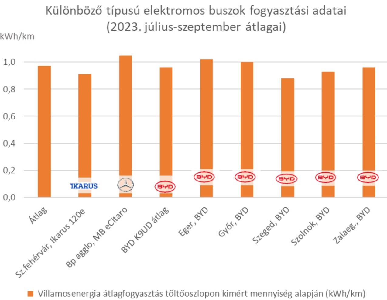 Az Ikarusok mellett az idén forgalomba állított BYD-kre sem lehet panasz energiafelhasználás szempontjából, a teljes flotta ugyanis a nyári hónapokban, valamint szeptemberben 0,95 kWh/kilométeres átlagfogyasztást tudott felmutatni. Az összesen 48 jármű tavasz óta 837 ezer kilométert tudhat maga mögött, mindezt 799 ezer kWh-nyi betöltött energia felhasználásával produkálták, 99,4 kWh/100 kilométer átlagfogyasztással, átlagosan 280 kilométeres hatótávval. A járművek fogyasztása felhasználási területenként, topográfia viszonyoktól függően kisebb-nagyobb eltéréseket mutat, Egerben valamivel 1 kWh feletti,  Győrben kereken 1 kWh, Szegeden 0,9 kWh alatti, Szolnokon 0,92-093 kWh, Zalaegerszegen pedig 0,95 kWh átlagfogyasztás figyelhető meg.