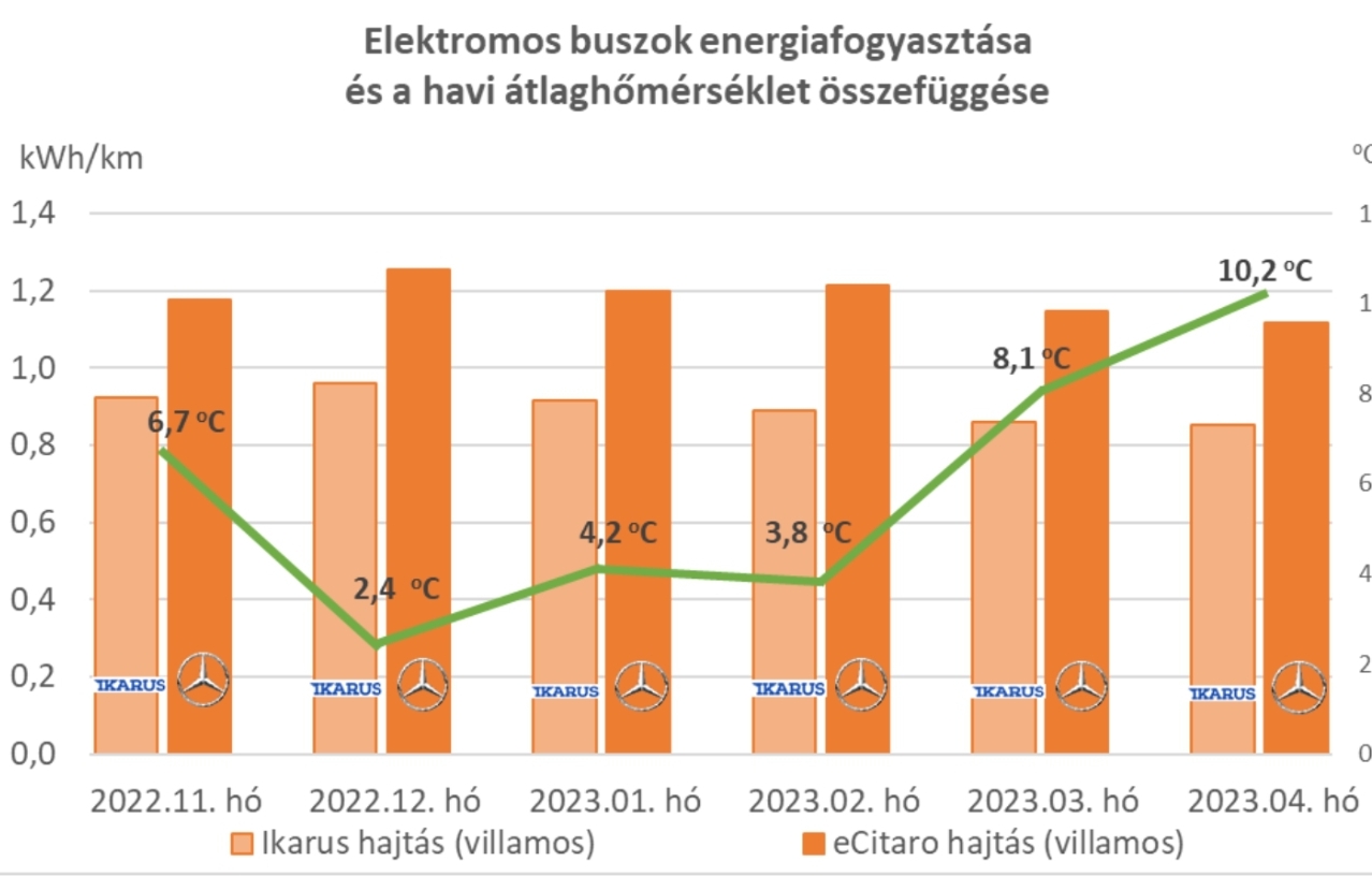 Téli üzem tekintetében egyelőre csak az Ikarusokról és az eCitarókról állnak rendelkezésre adatok. Előbbi típus fogyasztása a 2022 novembere és 2023 áprilisa közötti időszakban mindvégig 0,9 kWh körül mozgott kilométerenként, és még a leghidegebb hónapban sem emelkedett 1 kWh fölé. Az eCitarók stabilan tartották az 1,1 kWh/kilométer fölötti értéket, decemberben és februárban pedig átlagfogyasztásuk megugrotta az 1,2 kWh-át is. A vizsgált időszakot az Ikarusok gázolajos fűtőkészülékei 6,1 liter/100 kilométer, a Mercedeseké pedig 2,9 liter/100 kilométer átlagfogyasztással teljesítették, ez a járműhajtáshoz hasonlóan kWh-ban kifejezve és 1 kilométerre vetítve, 0,62 és 0,29 kWh.