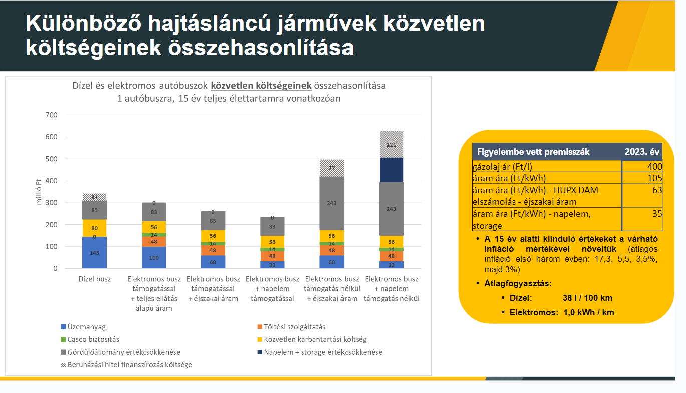 A Volánbusz 38 liter/100 kilométer és 100 kWh/100 kilométer átlagfogyasztáson alapuló számításai alapján, a jelenlegi energiaárak mellett egy dízelbusz üzemanyagköltsége 15 ezer, egy elektromosé a teljes ellátás alapú áram felhasználásával 10 ezer, éjszakai árammal 6 ezer, napelemmel pedig 3,5 ezer forint 100 kilométerre vetítve.