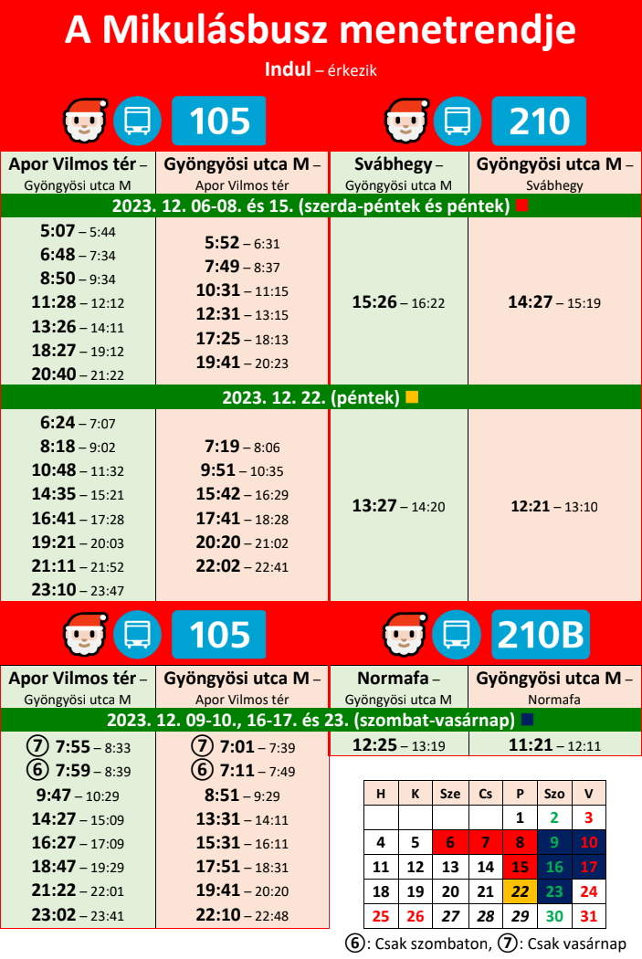 A Mikulásbusz ebben az évben a 105-ös és a 210-es (hétvégenként a 210B) jelzésű viszonylatokon közlekedik majd a cikkünk alján olvasható menetrend szerint, egészen december 23-ig. A BKV megjegyzi, hogy a különleges jármű azokon a napokon is igazi ünnepi meglepetést okozhat, amikor a menetrend szerint nem jár, a dél-pesti régióban ugyanis bármikor felbukkanhat (a jármű a BKV többi Van Hool autóbuszához hasonlóan a Dél-pesti Autóbuszgarázs állományába tartozik). A Mikulásbuszon normál díjszabással, érvényes menetjeggyel lehet utazni.