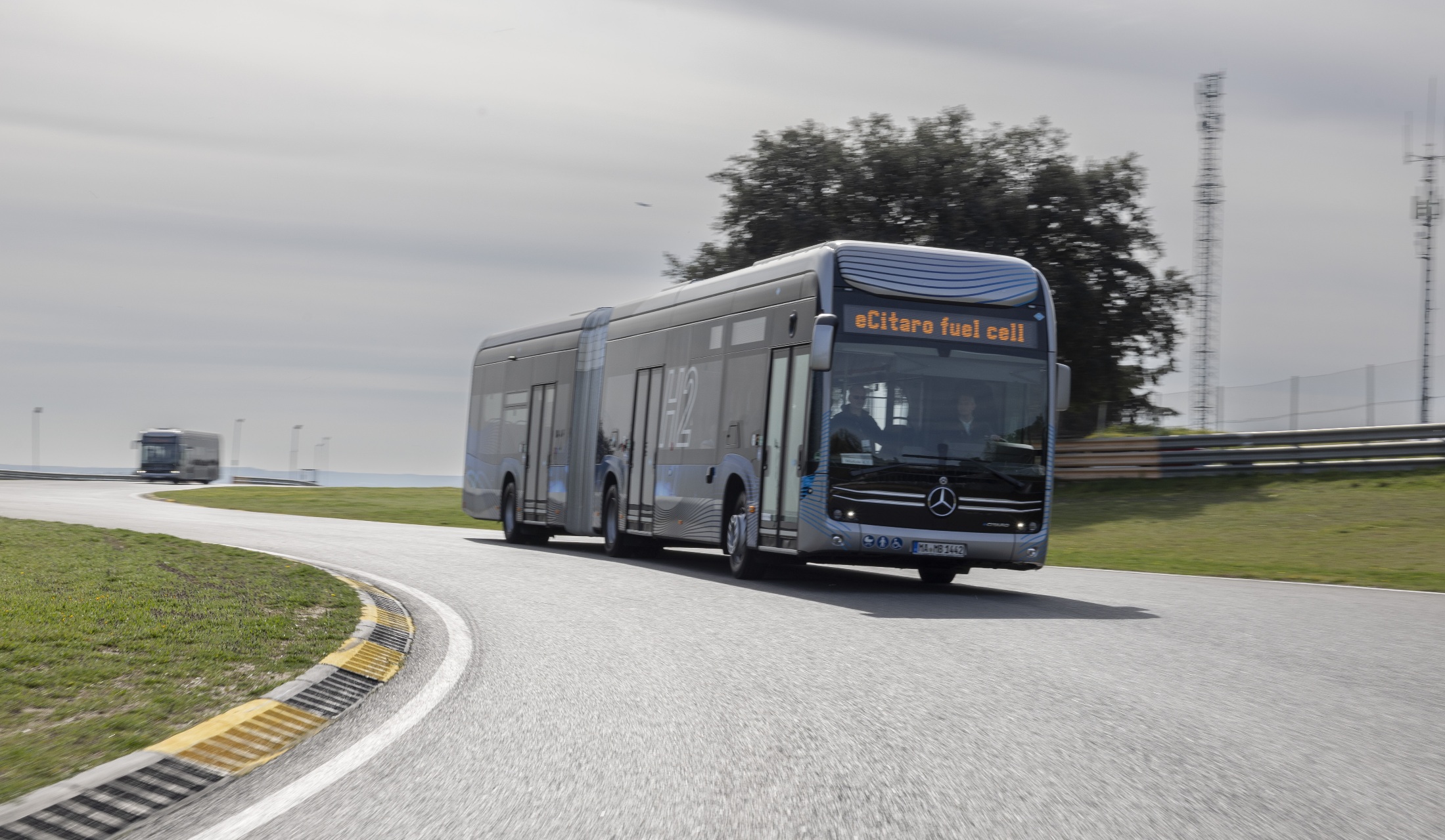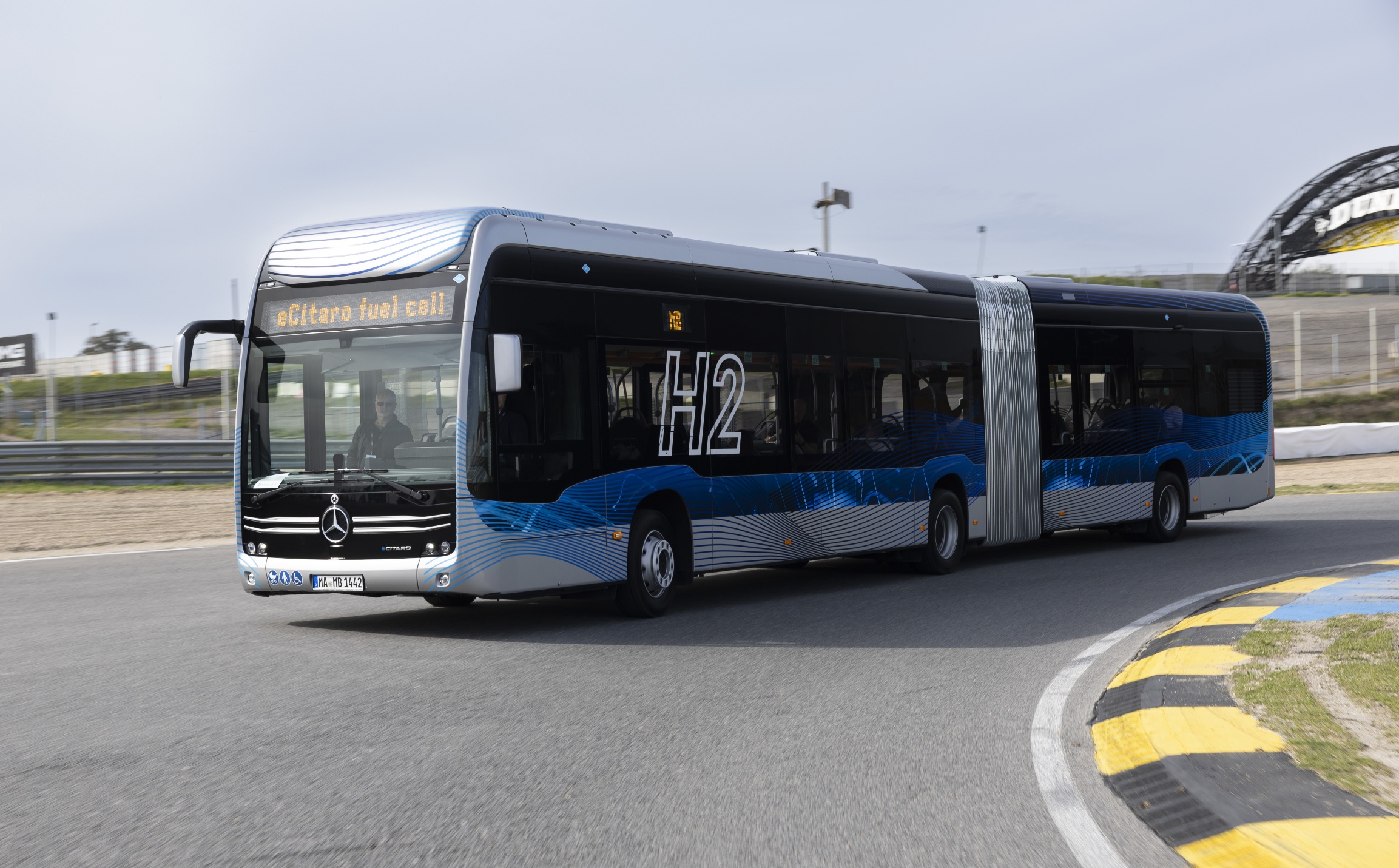 A jármű a próbakörök tapasztalatai alapján a vezetés szempontjából nem különbözik észrevehetően a tisztán elektromos hajtású változattól. Arra, hogy egy hidrogénhajtású buszról van szó, csak egy, a műszerfalon százalékos feltöltöttségi értéket mutató műszer emlékeztet. A méretei ellenére a 18 méteres monstrum simán gyorsult még enyhe pedálhasználat mellett is, teljesítményleadása fokozatos és egyenletes volt, s alapvetően jól vette a versenypálya kihívásait. A kanyarokba nagy sebességgel belépve viszont a magasabb súlypont hatása érezhető volt, annak ellenére is, hogy a billegés- és bólintáscsillapítási rendszer kompenzálta a magas súlypontból eredő instabilitást. Sík terepen a jármű érzékenysége és könnyedsége elfeledtette velünk, hogy üresen egy 20 tonnás csuklósban ülünk, viszont a nagyobb emelkedőket, amelyekre a hat darab Type 4-es hidrogéntartállyal és ehhez mérten nagy, 2,5 tonna súlyú beépített NMC akkukapacitással (392 kWh, ez a típushoz kérhető maximum), valamint a 240 kg-os üzemanyagcellával szerelt kocsi a vártnál egy picit lomhábban tudott csak felkapaszkodni. A regeneratív fékrendszernek köszönhetően csak ritkán kellett használni az üzemi fékeket, a jármű lassulására már a gázpedál felengedésével sor kerül. Emellett a regeneratív fékezéssel sokkal finomabban lehet lassítani járművet, és a fékút is jelentősen csökkenthető.