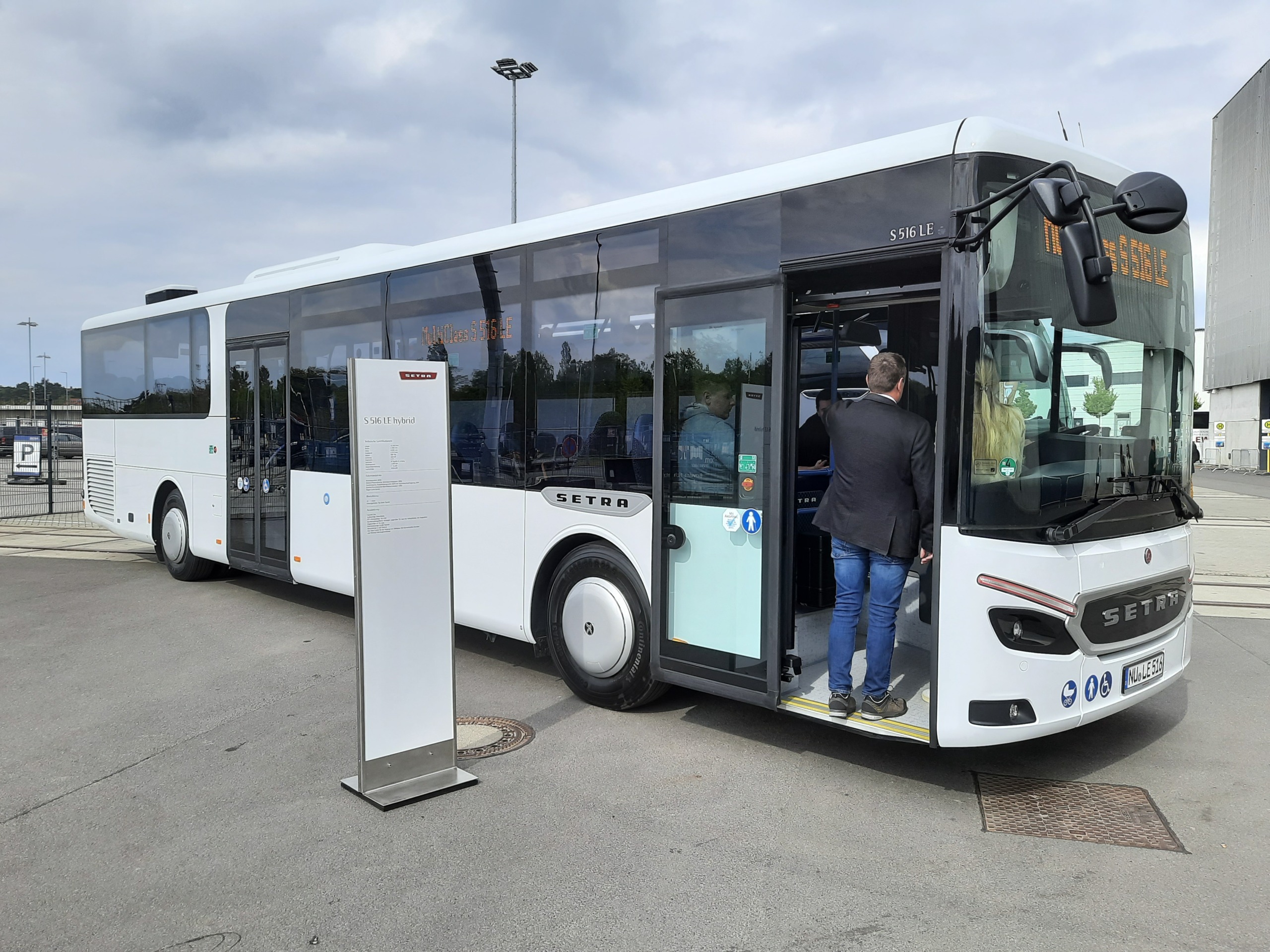 A kültéri részen kapott helyet a Setra két járműve, amelyek a többi itt kiállított autóbuszhoz hasonlóan egy kicsit elárvultak a váratlanul hideg időjárás miatt. A hosszas várakozás után tavaly megújult MultiClass szériát ezúttal a leghosszabb kéttengelyes verzió, az S 516 LE hybrid képviselte, a jellegzetes mézarany bemutatófényezést mellőzve ezúttal egyszerű fehér színben – a kiegészítő lágyhibrid hajtásmodullal felszerelt alacsony belépésű helyközi busz is egyike volt azon járműveknek, amelyeket az érdeklődők akár egy gyors tesztkörre is elvihettek. A típuscsalád lágyhibrid változatát rövidebb karosszériával ugyan, de azonos műszaki tartalommal mi is kipróbáltuk a közelmúltban egy menetpróba keretében, az ott szerzett tapasztalatainkat ebben a cikkünkben foglaltuk össze.