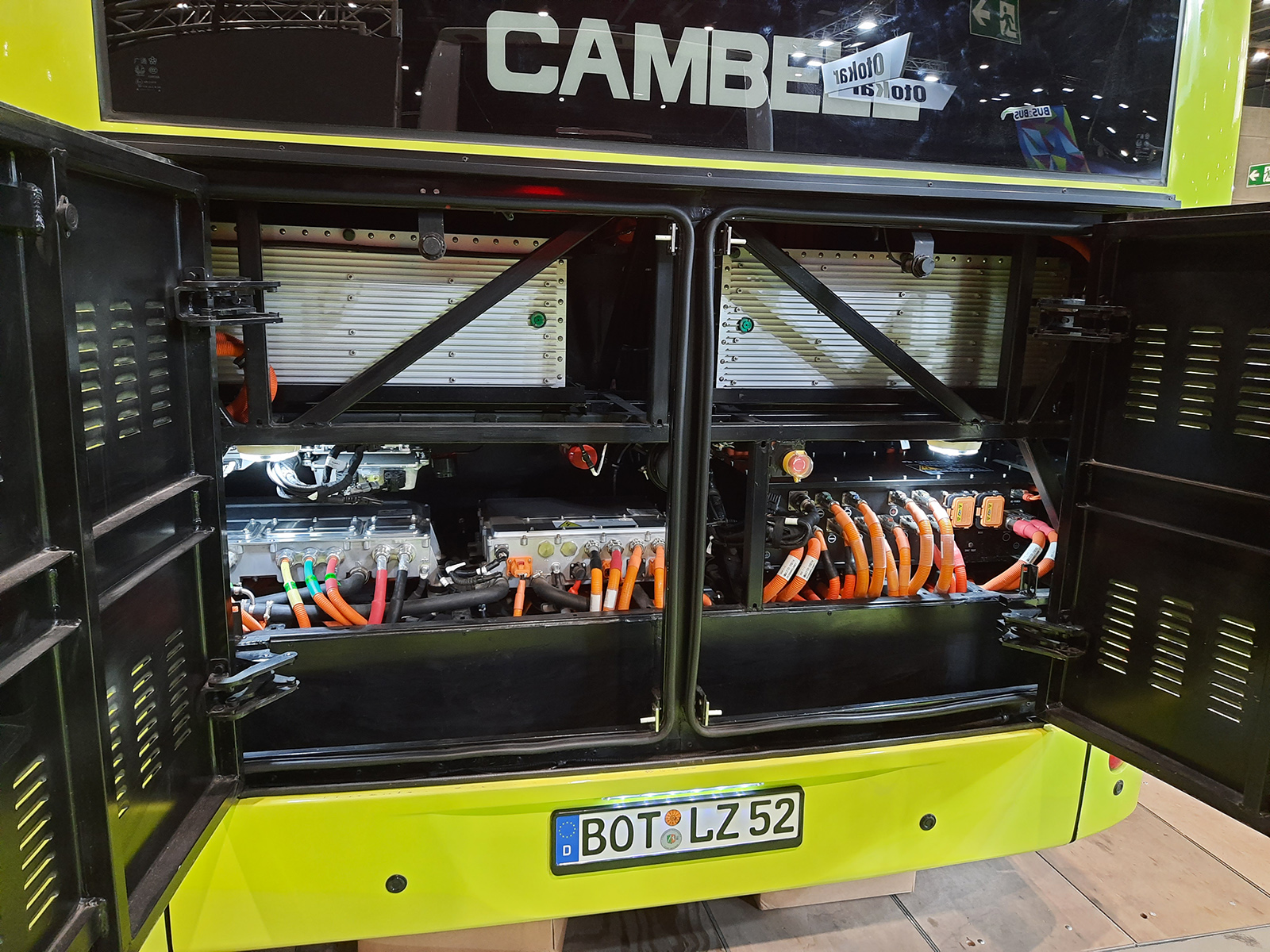 Az almazöld bemutatókocsi utastere viszonylag jó benyomást kelt minőségérzet szempontjából, a hátsó rész kialakítása ugyanakkor kívül-belül a régebbi kínai buszokat idézi az ablak nélküli, szekrényszerű hátfallal. A szokatlan, függőleges zsanérozású kétszárnyú „motortérajtó” mögött lítium-titanát-oxid (LTO) vontatási akkumulátorok sorakoznak (ezeket szükség esetén oldalirányból lehet kiemelni a buszból) 101,8 kWh összkapacitással, de opcionálisan 422,8 kWh-ás lítium-vasfoszfát (LFP) akkupakk is kérhető. Előbbivel 65-105, utóbbival 300-450 kilométeres hatótávot ígér a Cambell az üzemeltetési viszonyoktól függően. A kiállított példány a felnyíló pantográfos gyorstöltésre (360 vagy 480 kW) optimalizált kivitelt képviseli, de kérhető inverz pantográfos megoldás is és természetesen plug-in töltésre is van lehetőség, utóbbihoz két CCS töltőaljzat is elhelyezhető a busz jobb oldalán. A meghajtásért 145 kW állandó-, és 245 kW csúcsteljesítményű állandómágneses szinkron villanymotor felel.