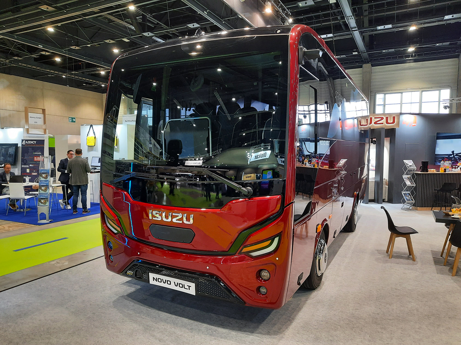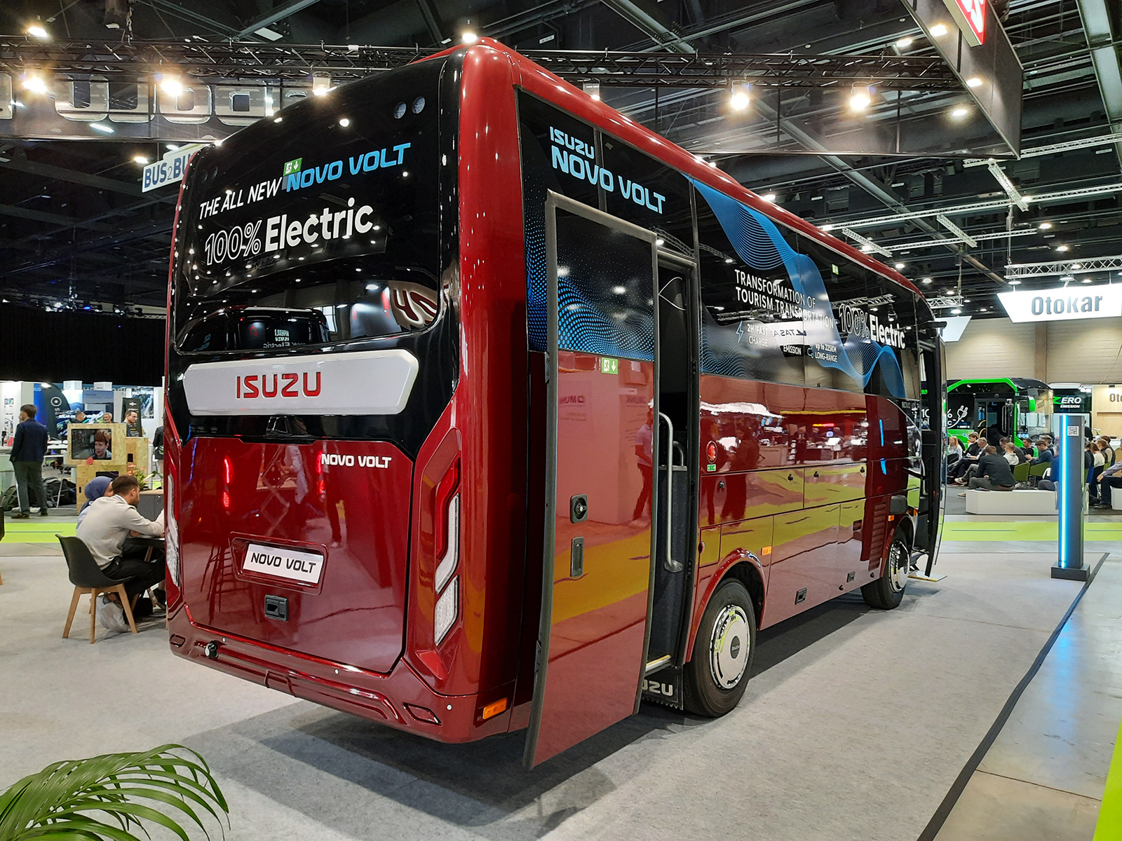 A nagyobb európai buszkiállítások rendszeres résztvevője az Anadolu Isuzu, amely ezúttal szintén két típussal képviseltette magát. A japán gyökerekkel rendelkező török cég piacvezető helyet foglal el a midibuszok szegmensében Európában, nem meglepő tehát, hogy a berlini seregszemlére is ilyen járművekkel érkeztek. Az egységesen elegáns bordó színben megjelent járműveket tavaly októberben a brüsszeli Busworld Europe 2023 kiállításon is láthattuk már. Az igazi újdonságot közülük a Novo Volt nevű, távolsági jellegű midi villanybusz jelenti, amely nevének megfelelően az orrmotoros Novo midibusz tisztán elektromos hajtású megfelelője, modernizált formatervvel. Az apró, legfeljebb 29 utasüléssel felszerelhető turistabusz alapvetően továbbra is teherautó-alvázra épül, amit azonban jelentősen módosítottak annak érdekében, hogy képes legyen a 320 kW csúcsteljesítményű Allison eGen Power 85S elektromos hátsó híd fogadására. A turizmusban érdekelt török vállalkozások körében nagyon népszerű kategória fő vonzerejét jelentő csomagtér kisebb ugyan, mint a hagyományos dízelmotoros változaté, de azért használható méretű maradt. Ezt úgy oldották meg, hogy az akkumulátorok nagyjából a járműtest középsíkjában, megemelve helyezkednek el, így alattuk/mellettük és mögöttük még marad hely a poggyászok számára. A 600 V-on működő, 165 kWh összkapacitású akkupakk által kínált legfeljebb 225 kilométeres hatótáv ugyanakkor sokkal inkább csoportos reptéri transzferekhez teszi alkalmassá a 2025-ben piacra kerülő típust, mintsem hosszabb kirándulásokra. A busz töltésére CCS Type 2 interfész szolgál.