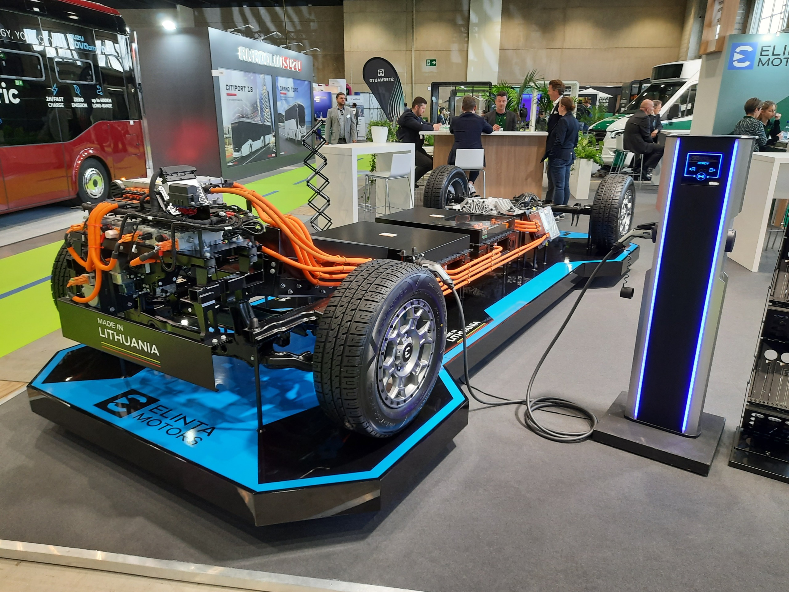 A Németországban komoly piaci pozíciókkal rendelkező litván Altas Auto standján két járművet lehetett megtekinteni. A cég specialitásának számító, kisáruszállító-alapú minibuszok közül idén a Mercedes-Benz Sprinter bázisára épített, Novus Multiline fantázianevű távolsági kreációt hozták el, az ugyancsak litván Elinta Motors által szállított elektromos hajtáslánccal felvértezve. A 7367 mm hosszú, 2020 mm széles és 2703 mm magas minibuszt egy 150 kW csúcsteljesítményű központi villanymotor hajtja, a beépített 115 kWh összkapacitású vontatási akkucsomag pedig UITP SORT 2 mérési ciklus szerint 270 kilométeres hatótávot biztosít. Az inkább személyautós méretű akkupakk 100 kW-os gyorstöltéssel akár 50 perc alatt feltölthető, a kíméletesebb 19,8 kW-os váltóáramú töltéssel 6 órát vesz igénybe a folyamat. Az Altas Auto termékeire jellemző, minőségi kidolgozású beltérben 19 utasülés található. A magát prémiumgyártóként pozícionáló cég egyébként kifejezetten a fizetőképes nyugati piacokra dolgozik, Közép- és Kelet-Európában jelenleg nem látnak megfelelő üzleti potenciált, olyannyira, hogy még a hazai, litván piac is mindössze 5%-át adja a forgalmuknak.