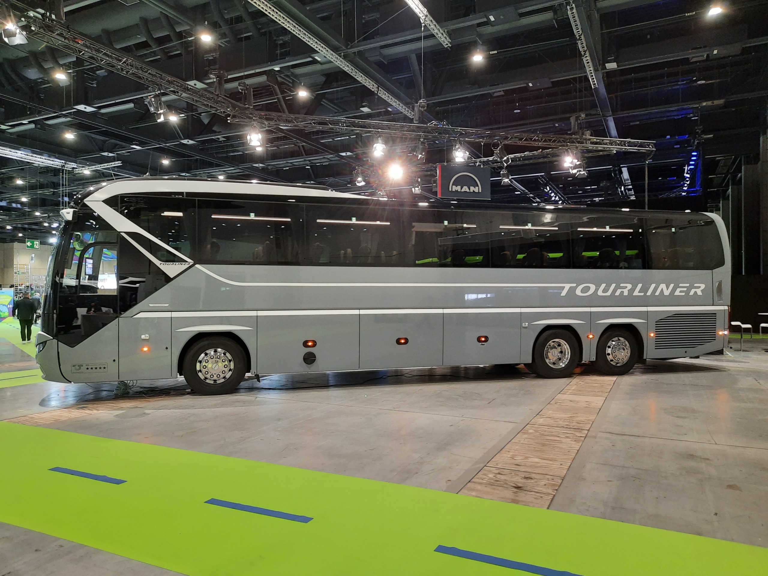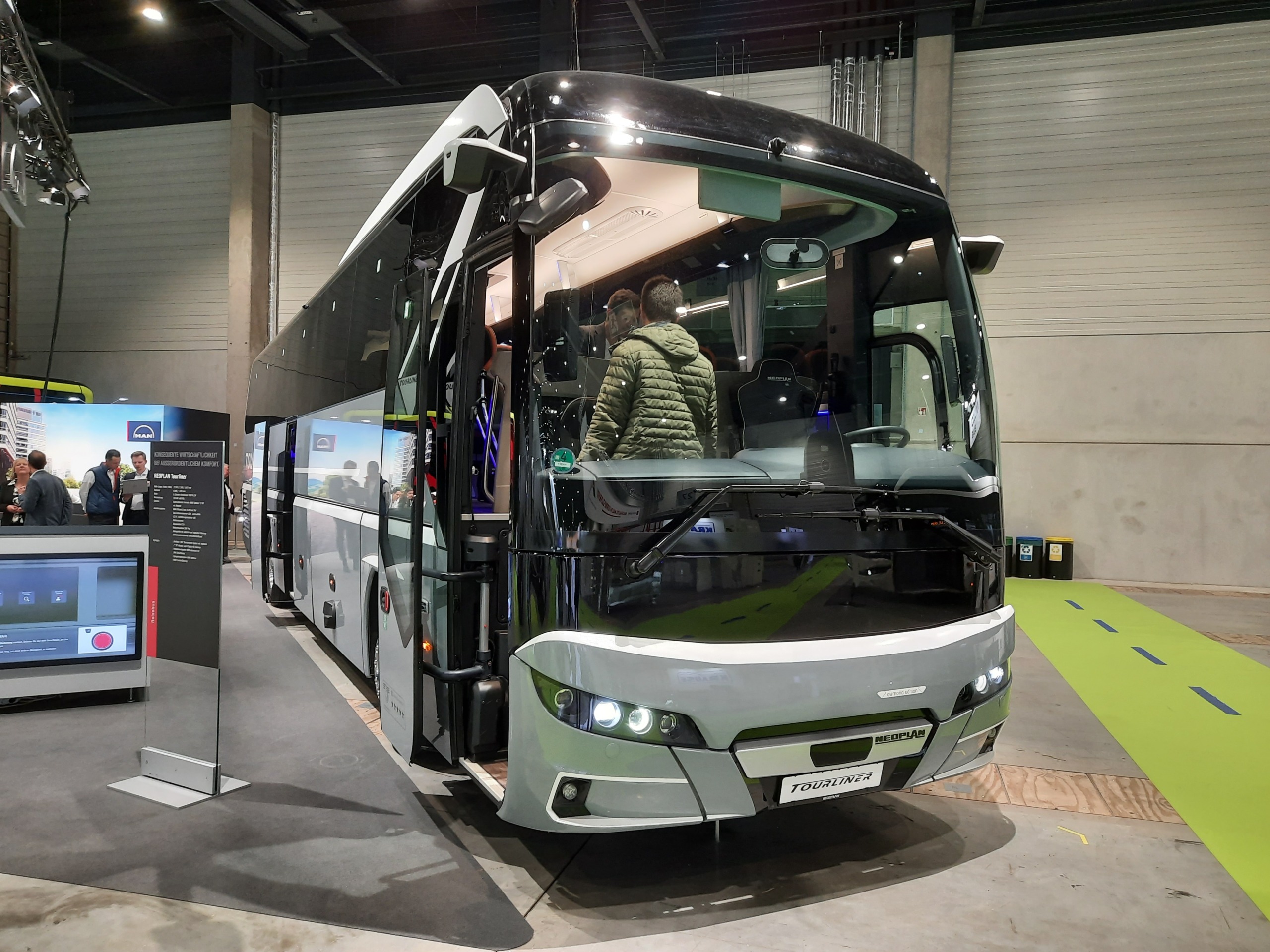 Az egykor szebb napokat látott Neoplan kínálatából ezúttal egy háromtengelyes Tourliner L luxus turistabuszt hoztak el a berlini kiállításra, amely 13,9 méteres hosszával a típuscsalád leghosszabb tagja. Újabb modellek bemutatása már hosszú évek óta várat magára a nagy múltú cég háza táján, így az MAN különféle limitált szériákkal igyekszik fenntartani az érdeklődést a kissé elfeledett prémiummárka iránt – a Berlinben kiállított verzió a „diamond edition” nevet viseli. Az impozáns bemutatóbuszba egyébként hathengeres, 480 lóerő (353 kW) teljesítményű MAN D2676 LOH erőforrás került MAN TipMatic 12 OD automatizált váltó társaságában, pazar felszereltsége pedig a különféle vezetőasszisztens és balesetmegelőző elektronikák armadája mellett többek között MAN SmartSelect funkcióval kiegészített infotainment rendszert és a jármű környezetéről 360°-os madártávlati képet adó kamerarendszert foglal magába, a már említett MAN OptiView digitális tükörhelyettesítővel együtt.