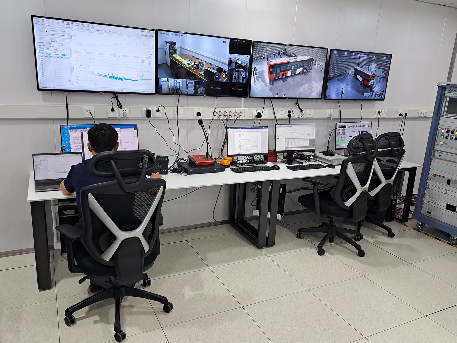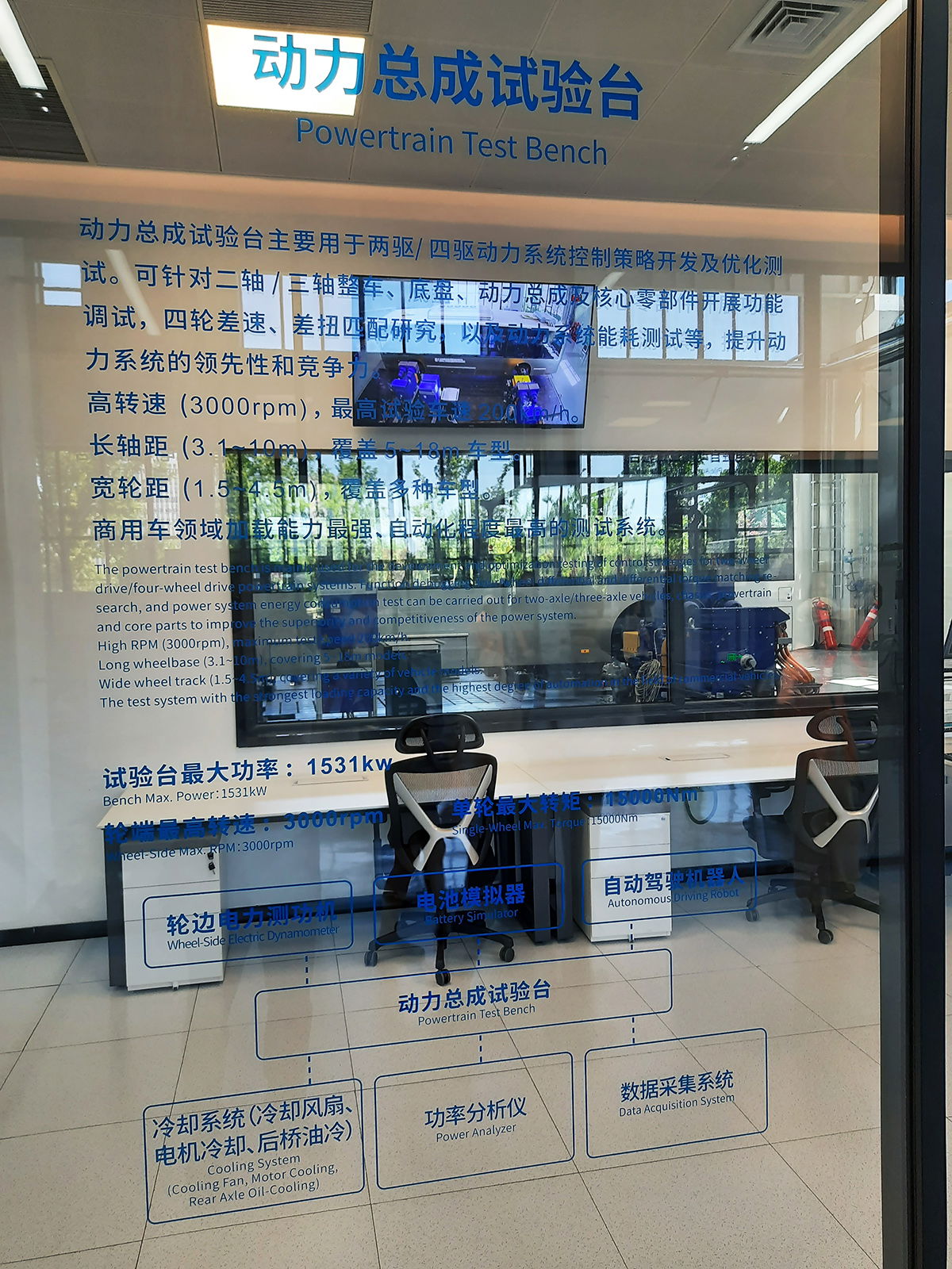 A Yutong és a csengcsoui üzem történetével, valamint a buszgyártás folyamatának egyes munkafázisaival való megismerkedés után a nap második felében a kutatás-fejlesztési részleg és a számos kísérleti labort magába foglaló tesztközpont meglátogatása szerepelt a programban. A cég elektromos busztípusai a sorozatgyártás megkezdése előtt 83 különböző szigorú biztonsági teszten és vizsgálaton esnek át. A különféle kisebb tesztpadok és elektromos mérőlaborok szinte csak említés szintjén kerültek bemutatásra, mivel a szűkös időkeret miatt a vizit csak a leglátványosabb teszthelyszínekre korlátozódott. Az elektromos hajtáslánc különféle komponenseinek (DC/DC átalakítók, stb.) tesztelése, ellenőrzése és optimalizálása mellett többek között a karosszéria beépülő elektromos alkatrészeinek (lámpák, stb.) különféle üzemeltetési körülményeket reprodukáló vizsgálata, valamint a fedélzeti kommunikációs és vezérlőrendszer, illetve a termomenedzsment finomhangolása is itt zajlik. Mindezeken kívül kiemelt hangsúlyt fektetnek villanymotorokra, egyebek mellett külön laboratórium szolgál az erőforrások megbízhatóságának, vibrációjának, zajkibocsátásának, teljesítményének és energiafogyasztásának mérésére.