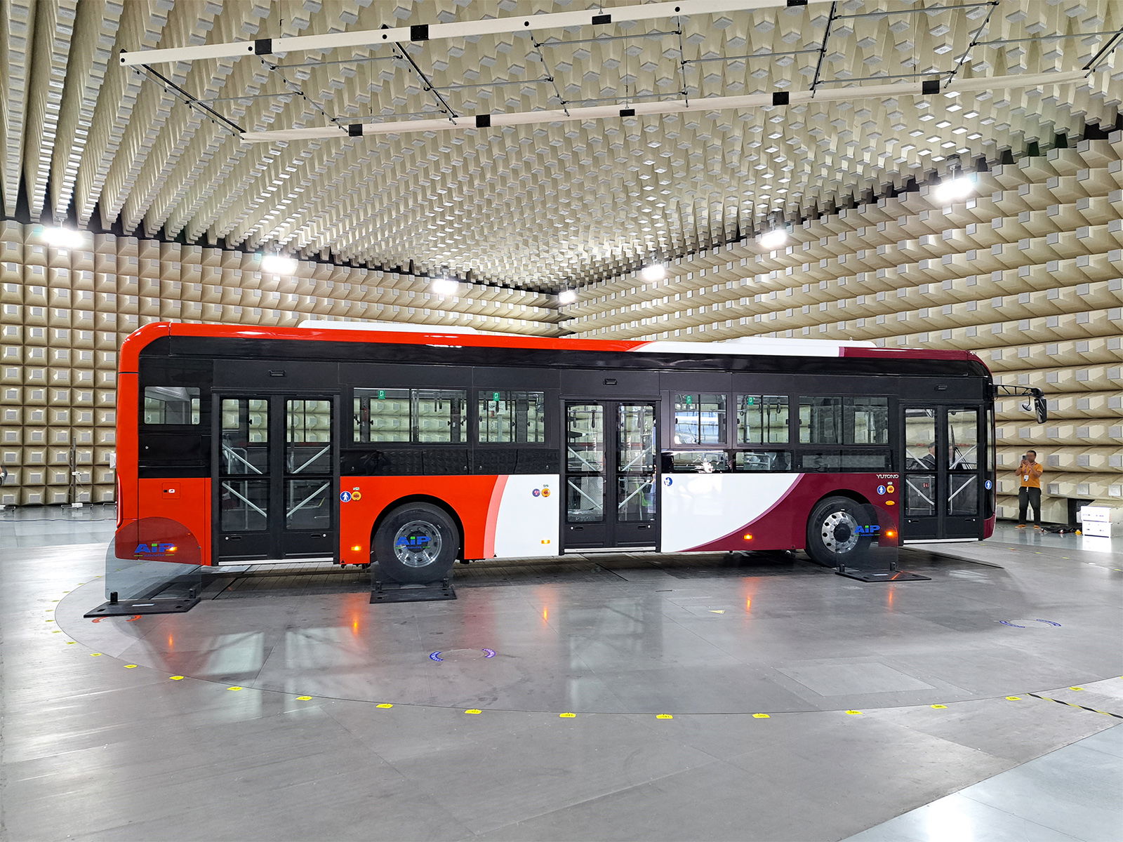 Vendéglátóink megmutatták az elektromágneses kompatibilitási (EMC) tesztkamrát is, ahol a jármű által kibocsátott, illetve az azt érő környezeti elektromágneses sugárzás hatását és az esetleges káros interferenciák kialakulását vizsgálják, különös tekintettel a motorra, az akkumulátorokra és az elektromos vezérlőrendszerre. Egyes zavarforrások (antennák) pozíciója rögzített, ezért a vizsgált buszt itt egy 360°-ban elforgatható, 14 méter átmérőjű platformon helyezik el, hogy minden irányból tanulmányozhassák az elektromágneses terek és hullámok hatását. Ezt a próbát nem végzik el minden egyes járművön, csak az új szériák egy-egy mintapéldányát vetik alá a tesztnek.