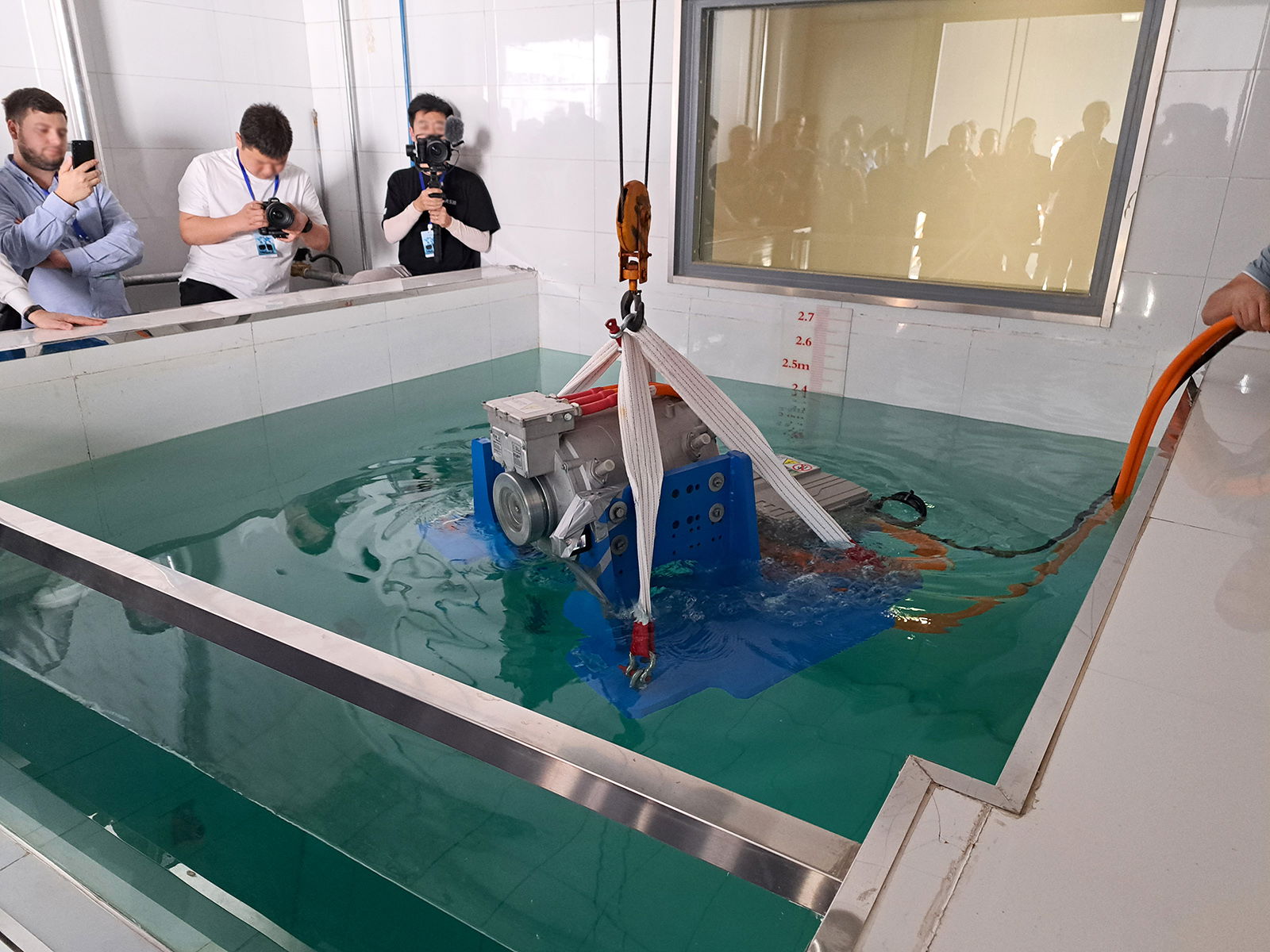 A Yutong kiemelt hangsúlyt fektet a villanybuszaiban használt elektromos hajtásrendszer-komponensek megbízhatóságára és biztonságára. Ennek szemléltetésére néhány egészen extrém példát is láthattunk a gyáriaktól. Elsőként egy járó villanymotort a hozzá tartozó inverterrel együtt egy 2,4 méter mély, vízzel teli medencébe engedtek. A motor a jól kivitelezett tömítéseknek és a hatékony szigetelésnek köszönhetően ezt követően is bármiféle zárlat vagy egyéb üzemzavar nélkül járt tovább a víz alatt, így gyár elektromos hajtásláncokért felelős mérnöke a tesztet hivatalosan is sikeresnek értékelte.