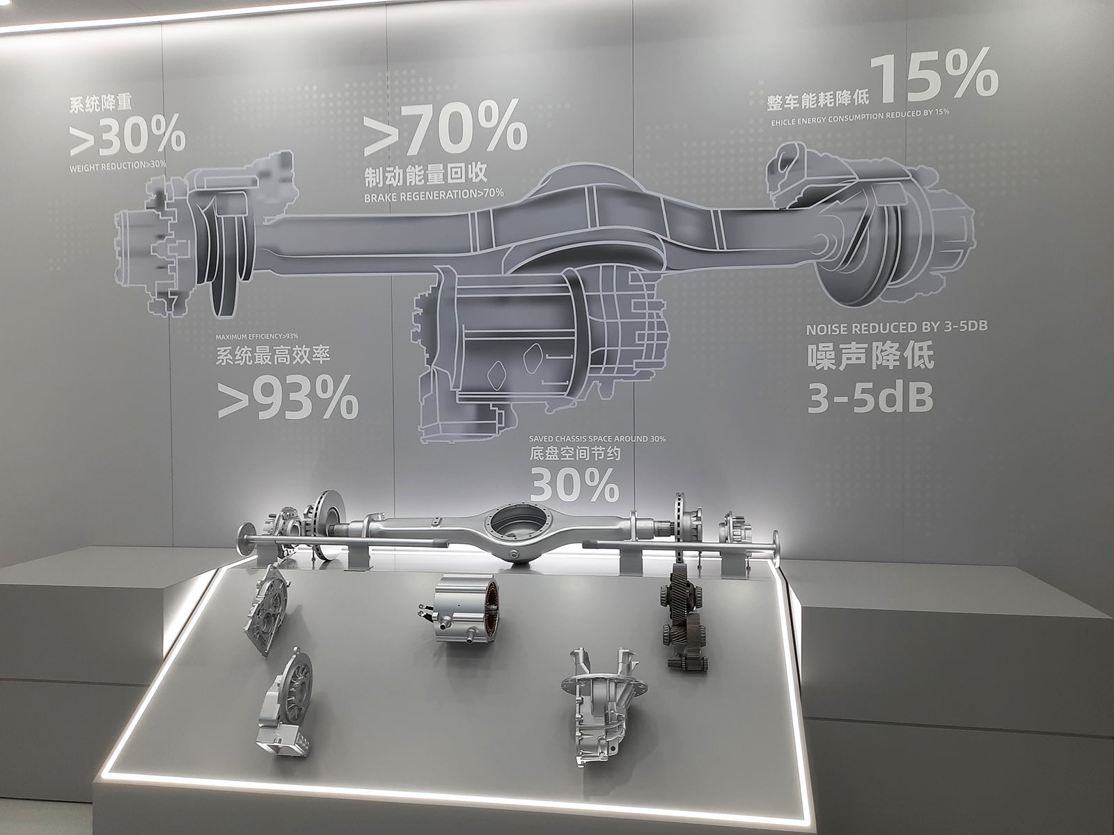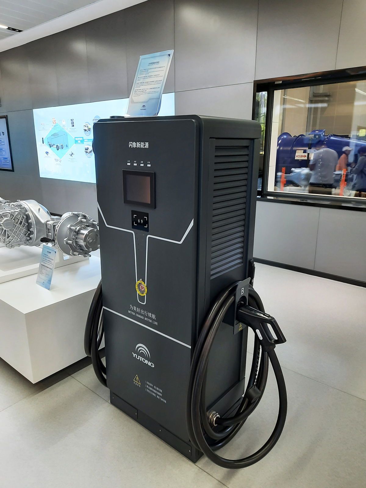 A tesztközpont folyosóján kisebb tárlat fogadott minket a Yutong aktuális innovációiból, alkalmat adva rá, hogy vendéglátóink röviden bemutathassák nekünk a cég legújabb vívmányait, így például a villanymotor, a kormányzás, a légkompresszor és a nagyfeszültségű rendszer vezérlését összefogó integrált kontrollert, az akár 500 kW teljesítményű töltésre is képes elektromos plug-in töltőberendezést, a vezeték nélküli akkumenedzsment rendszert (WBMS), az EA60 típusjelű könnyű elektromos hajtott hátsó hidat, vagy éppen a nitrogénalapú akkumulátortűz-védelmi rendszert, amit később működés közben is láthattunk. Ezen kívül komoly újításokkal rendelkeznek a hidrogénhajtás terén is – saját fejlesztésű, 60 kW-os üzemanyagcellájuk hatásfoka meghaladja az 57%-ot, élettartama pedig a 20 ezer üzemórát.