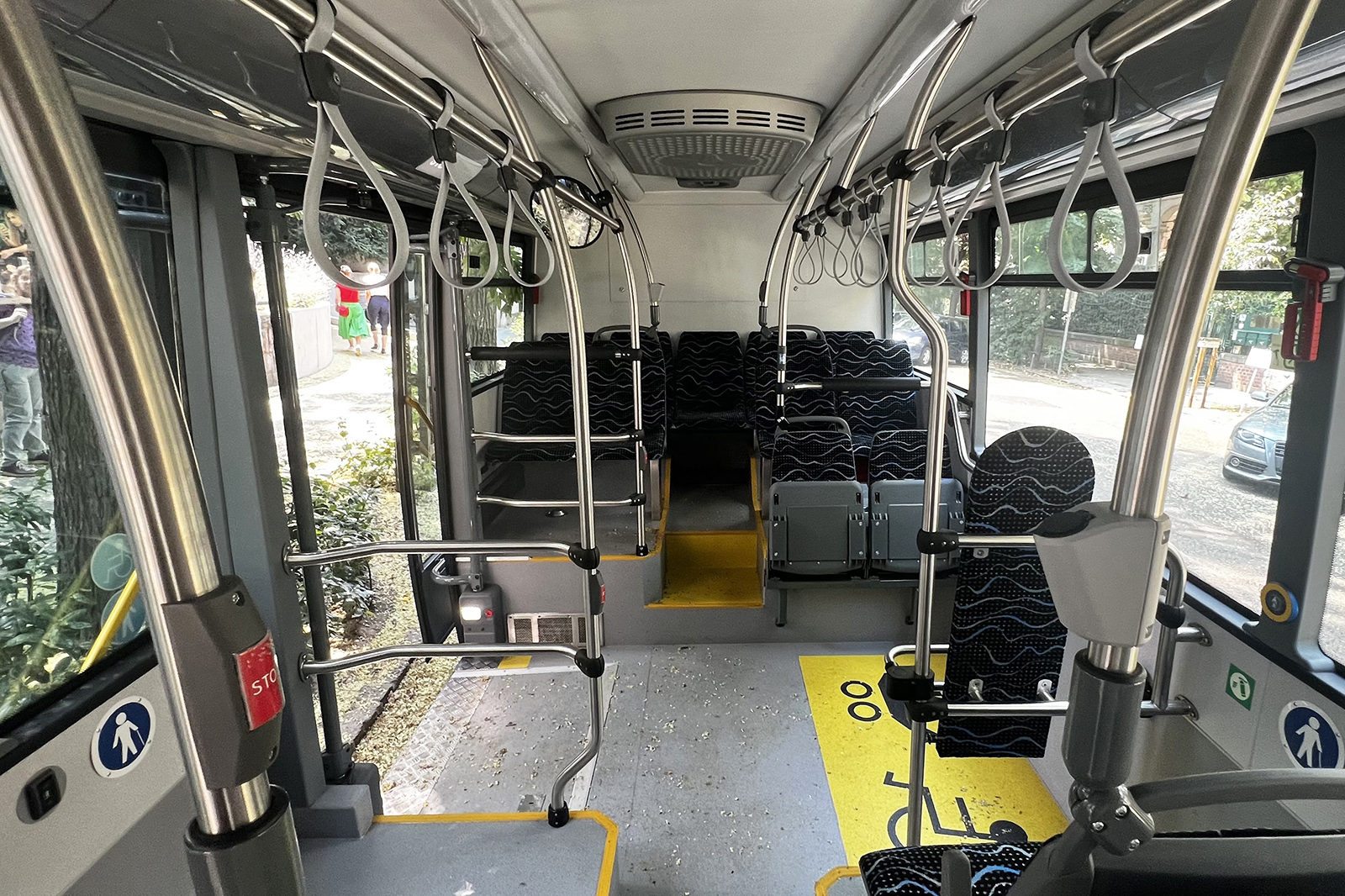 Az 1-2-0 ajtóelrendezés ebben a kategóriában megszokottnak számít, a 810 mm szélességű első ajtónyílást tovább szűkíti az erősen döntött A-oszlop. A középső, két felszállósávos ajtó szélessége 1210 mm, itt a vonatkozó előírásoknak megfelelően egy kézi működtetésű kerekesszékes rámpát is találunk, vele szemben pedig midibuszos mércével viszonylag tágas peronrész húzódik. Mindkét utasajtó kifelé nyíló, lengő kivitelű.