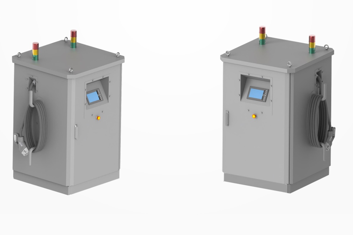 Idehaza ennél valószínűleg jóval nagyobb érdeklődésre tarthat számot a két töltőfejes CCS Combo 2 rendszerű, 1000 V legnagyobb kimeneti feszültségű plug-in töltőberendezés. Egy töltőfej használata esetén legfeljebb 120 kW (mind a kettő egyidejű igénybevételekor karonként maximum 60-60 kW) töltési teljesítmény áll rendelkezésre, ami valamelyest elmarad a buszos kábelcsatlakozós megoldásoknál manapság általánosnak tekinthető 150 kW-os teljesítménytől. A töltő moduláris teljesítményelektronikával rendelkezik, ami annyit jelent, hogy 20 kW-os alegységekből épül fel. Külön érdekesség, hogy a sajtótájékoztatón bemutatott adatok szerint csak -15°C és +40°C-os közötti környezeti hőmérsékleten lehet használni, ami korunk időjárási viszonyait tekintve igencsak szűk tartománynak mondható.