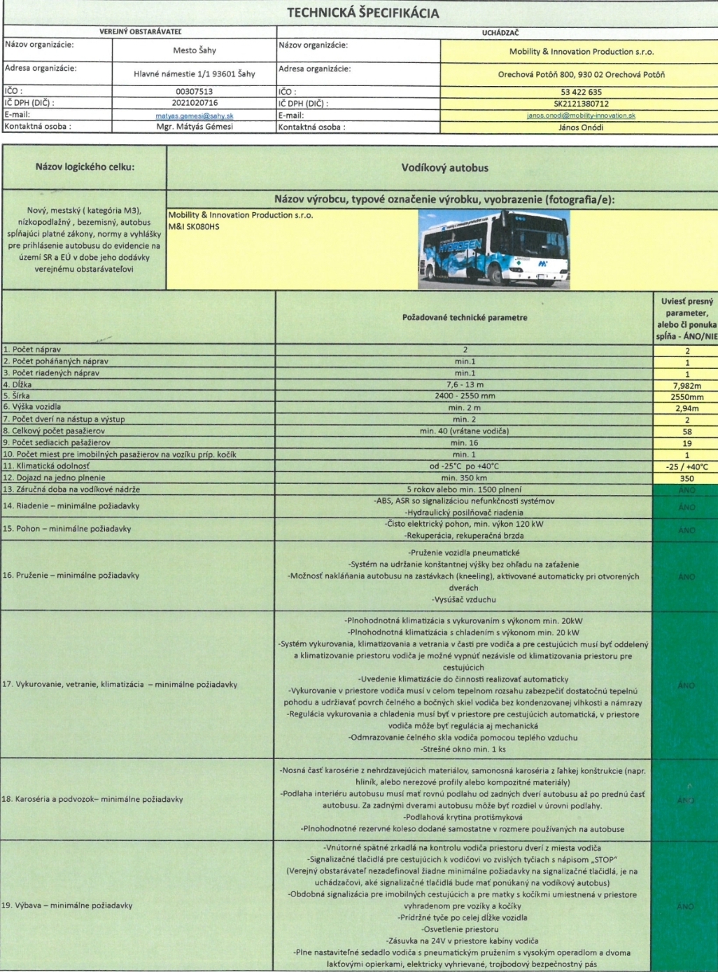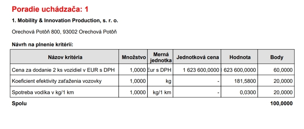 A döntés ugyan formai szempontból megfelelt a szlovák közbeszerzési jogszabályoknak, ám az érdemi verseny hiánya, valamint az értékelési rendszer felépítése gyakorlatilag kizárta más szereplők reális részvételének lehetőségét. A MIP ajánlata a maximálisan elérhető 100 pontot kapta: 60 pontot az 1 320 000 eurós ajánlati árra, 20 pontot a megadott 0,03 kg/km hidrogénfogyasztási értékre, valamint újabb 20 pontot a 181,58-as útterhelési hatékonysági mutatóra. Figyelembe véve, hogy az MIP által kínált konstrukció valójában nem klasszikus értelemben vett hidrogénüzemű autóbusz, hanem egy hidrogén üzemanyagcellás hatótávnövelővel ellátott elektromos jármű – ahol a fő energiaforrás egy 70 kWh kapacitású akkumulátor, a 30 kW teljesítményű üzemanyagcella csupán kiegészítő szerepet lát el –, az energiafogyasztást kizárólag a kilométerenkénti hidrogéngáz-felhasználással értékelni önmagában is súlyosan torzító. Az útburkolatra gyakorolt terhelés alapján kiosztott további 20%-os súlyozás pedig ebben az összefüggésben már szinte értelmezhetetlen.