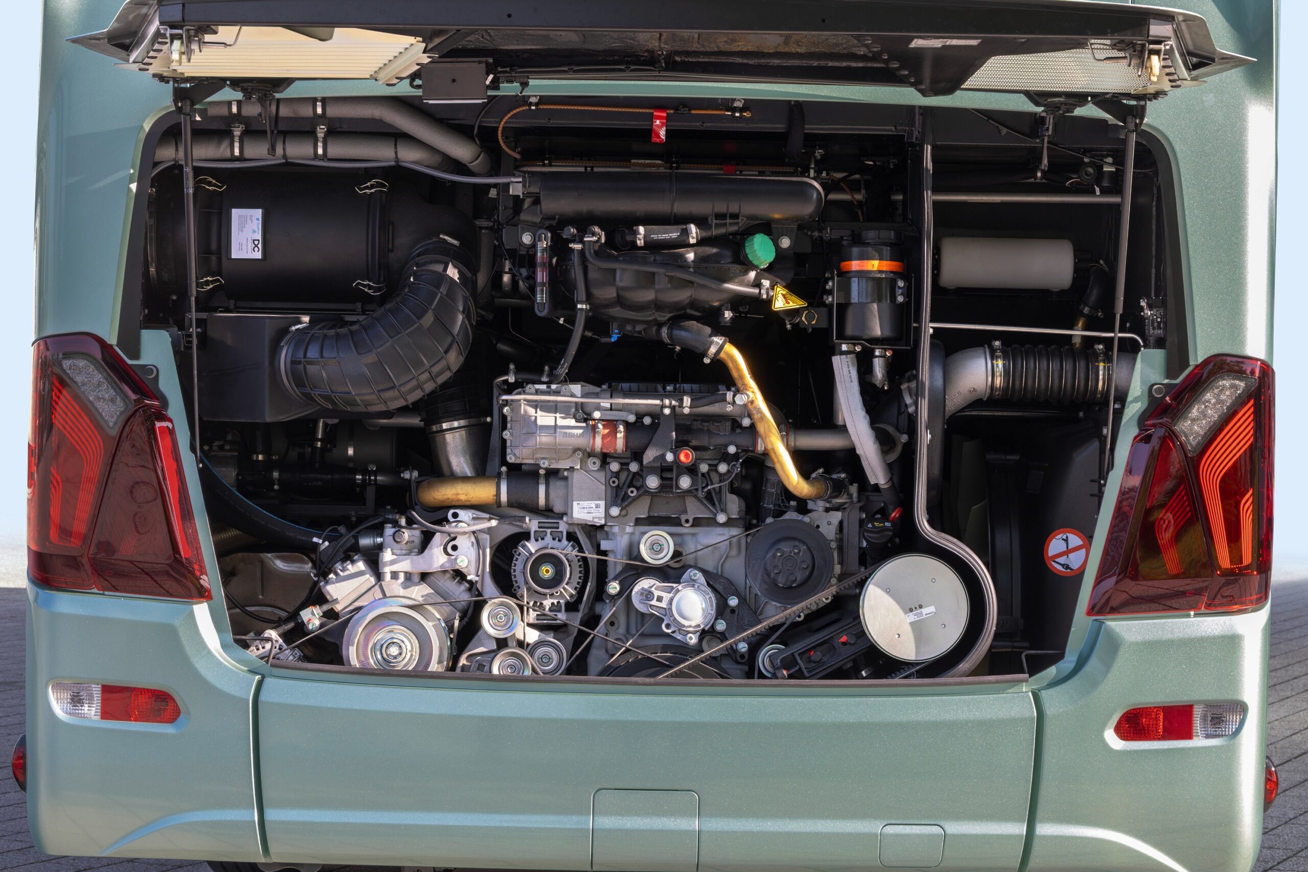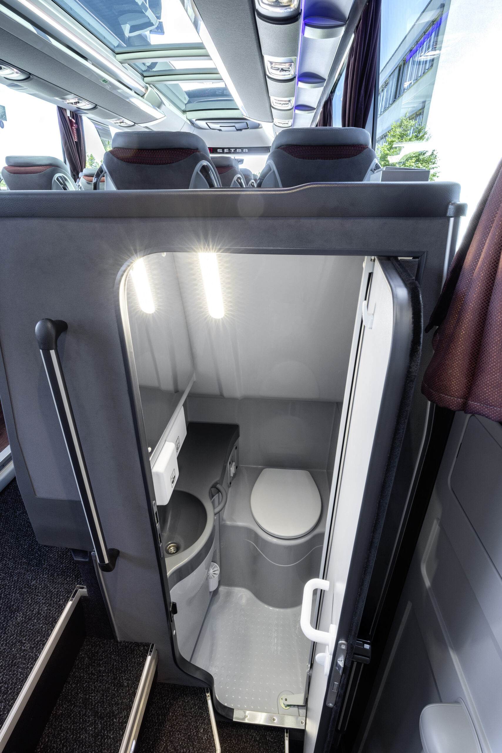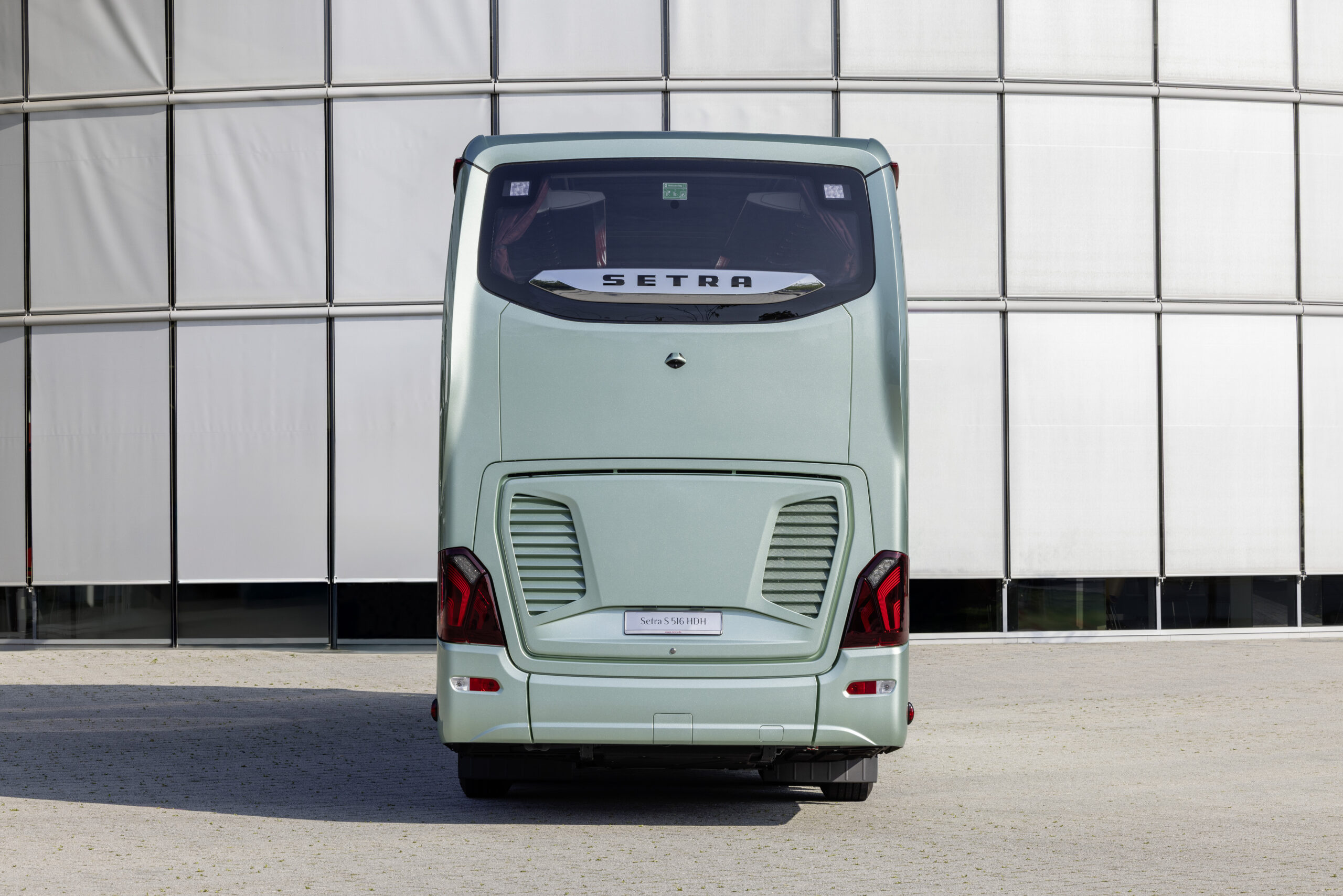 A márkaarculat a hátfalon is következetesen érvényesül, a hátsó lámpákba integrált, ívelt fénygrafikájú LED-es egységek alsó peremébe diszkréten megvilágított „Setra” jelzés került, amely nemcsak vizuális azonosító, hanem a termékhamisítás elleni védelem eszköze is. A részletgazdag kidolgozású fénytechnikai elemek így nem csupán esztétikai, hanem funkcionális szerepet is betöltenek a jármű kialakításában.