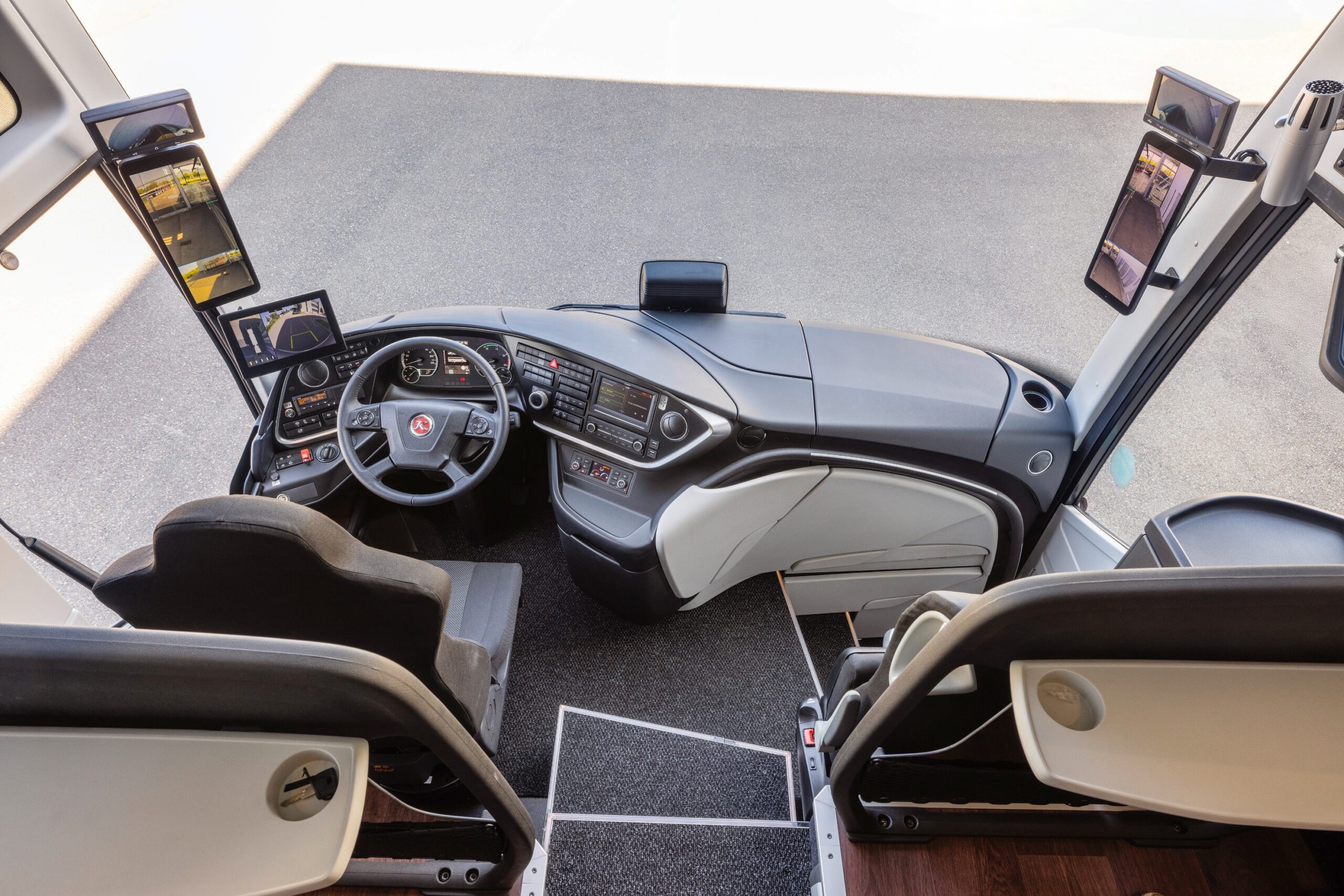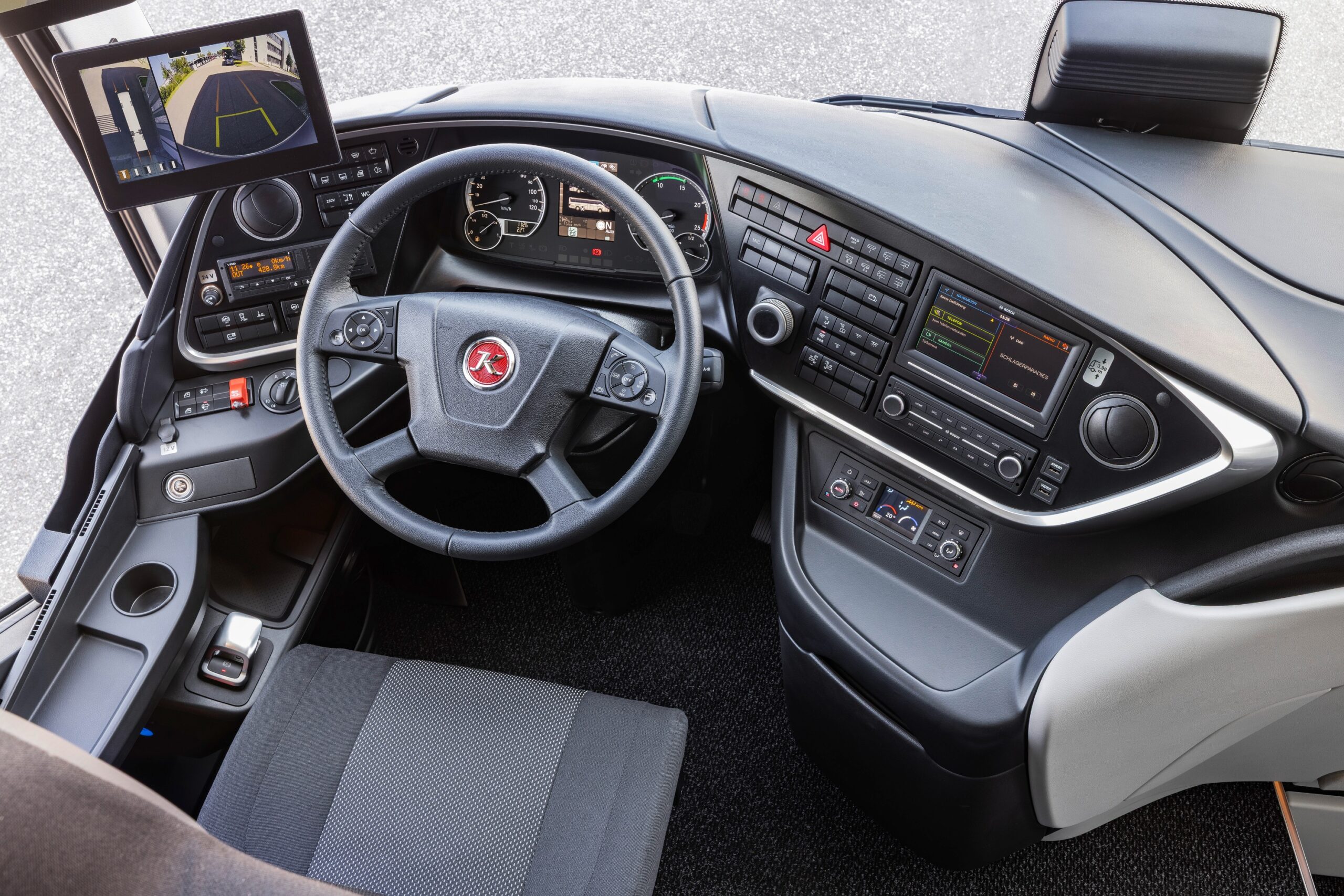 A vezetőállás a továbbfejlesztések eredményeként még inkább megfelel a vezetési kényelemre és a mindennapi használhatóságra vonatkozó elvárásoknak. Az ergonomikus kialakítást immár korszerű asszisztensrendszerek és digitális funkciók egészítik ki. Az új Keyless Start rendszer lehetővé teszi a jármű kulcs nélküli indítását, míg az alapfelszereltség részét képező elektronikus rögzítőfék automatikus aktiválással és Hold funkcióval támogatja a biztonságos elindulást emelkedőkön is. A rendszer emellett képes arra is, hogy megállás után automatikusan „behúzza” a rögzítőféket, amint a vezető kikapcsolja a biztonsági övet és elhagyja az ülést – ez hatékony védelmet nyújt a jármű véletlen elgurulása ellen. A High Beam Assist automatikusan vezérli a távolsági világítást, mindig az aktuális forgalmi helyzethez és a környezeti fényviszonyokhoz igazodva. A rendszer 35 km/h sebességtől aktiválódik, és 27 km/h alatt automatikusan kikapcsol. Működése során biztosítja az úttest optimális megvilágítását, így nemcsak a vezetési komfortot növeli, hanem a biztonságot is javítja, különösen kedvezőtlen látási körülmények között. A továbbfejlesztett 360°-os kamerarendszer négy kamera képét egyesíti madártávlati nézetté, és egy 10 colos képernyőn jeleníti meg a jármű környezetét – különösen hasznos segítséget nyújtva manőverezéskor és tolatáskor.