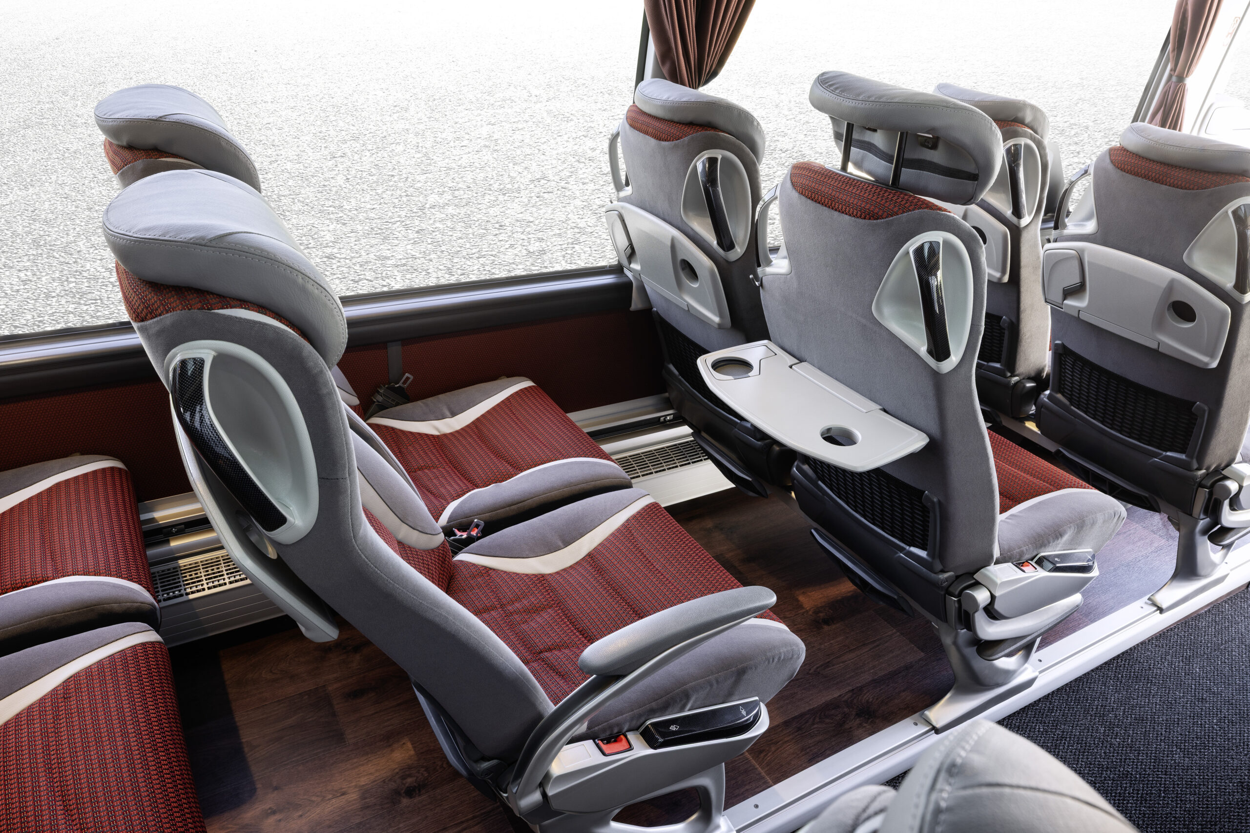 Az utastér maga is jelentős esztétikai és funkcionális megújuláson esett át: a színezett üvegbetétes válaszfalak elegáns térélményt nyújtanak, az új 360 fokban állítható légbefúvók fokozzák a kényelmet, a sötét tónusú belső színek pedig hatásosan emelik ki az üléskárpitok egyedi karakterét. Az opcionálisan rendelhető Ambiente illatosítórendszer nyolcféle illat közül választható aromával egészíti ki a prémiumkategóriás utazási élményt.