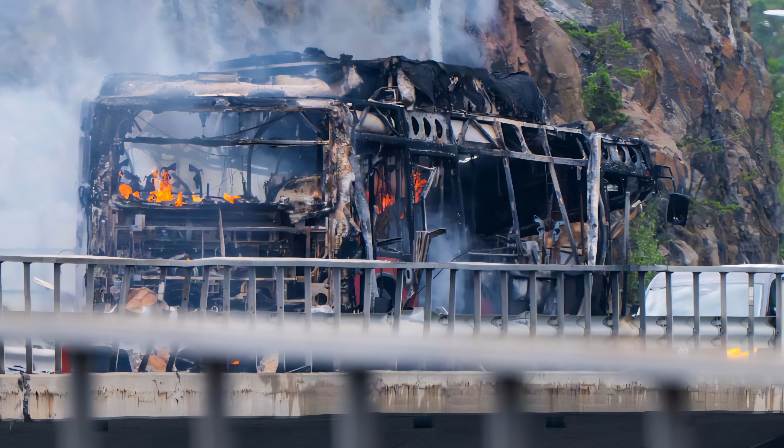 A frontális ütközést követően először a személyautó kapott lángra, az autóbusz csak később gyulladt ki. Egy helyszínen készült videófelvételen jól látható, hogy a busz tetején elhelyezett gáztartályok egyikéből oldalirányban tör ki lángcsóva, ami arra utalhat, hogy az egyik tartály megsérült, vagy működésbe lépett az egyik TPRD, azaz hőre nyíló túlnyomás-csökkentő szelep. Ez a biztonsági berendezés arra szolgál, hogy a 110 °C körüli hőmérséklet elérésekor kontrollált körülmények között engedje ki a gázt, megakadályozva a tartály robbanásszerű szétrepedését. Ha a gáz eközben meggyullad, egy függőleges irányú lángoszlop alakul ki, amely azonban nem terjed szét, így a folyamat kontrollált marad. A felvételek alapján azonban a lángok oldalirányban törtek elő, holott rendeltetésszerű működés esetén a gáznak felfelé kellene, hogy távozzon – éppen azért, hogy védje a busz közelében tartózkodó embereket, köztük a baleset helyszínén dolgozó mentőegységeket.