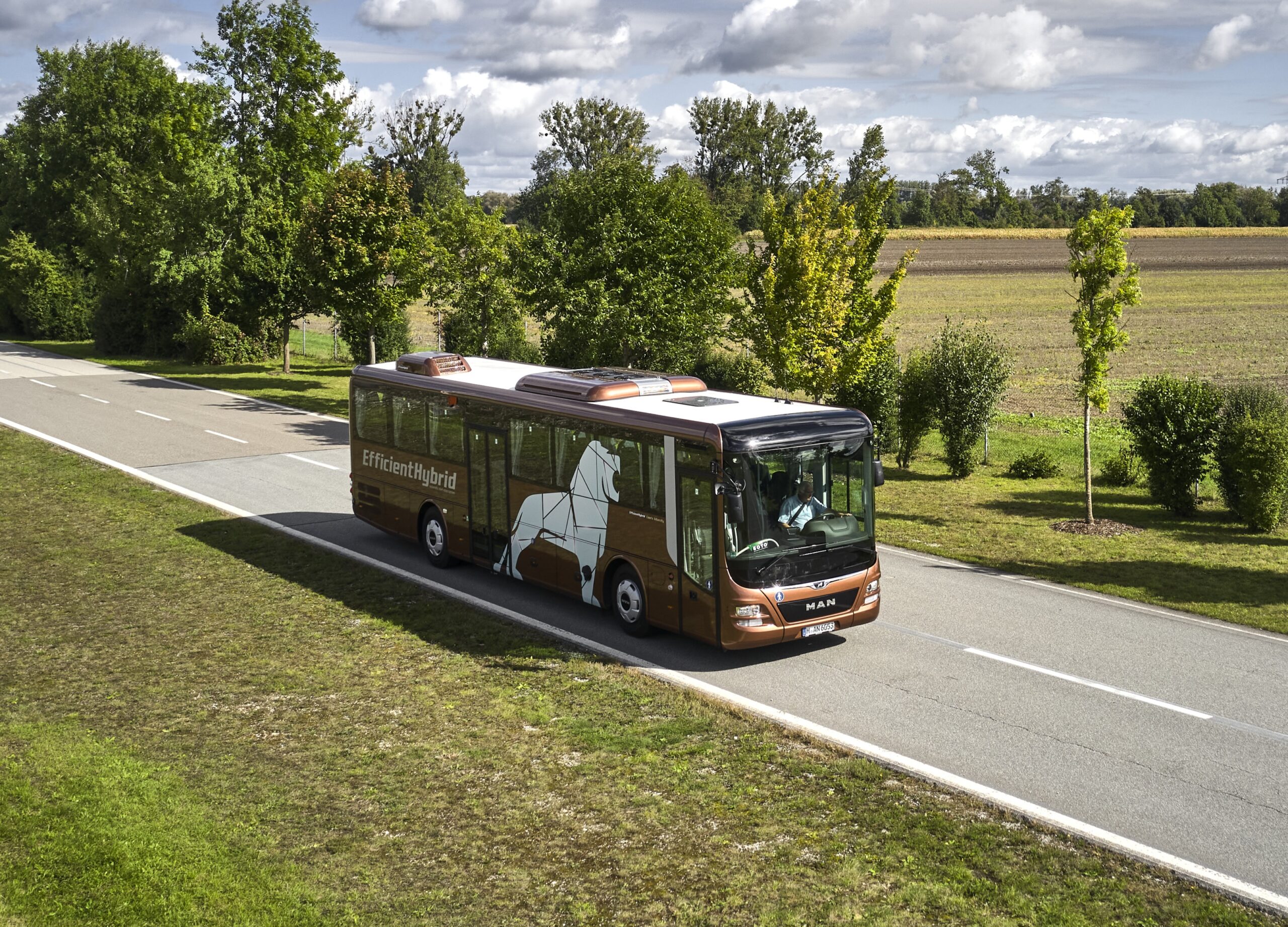 A csarnokon kívül pedig az MAN a korábbi generációs Lion’s Intercity lágyhibrid hajtásrendszerrel szerelt változatát állítja ki, amely a városi Lion’s City modellekben már bevált technológiát ülteti át a helyközi kategóriába. A hajtásláncot a 48 voltos szuperkondenzátoros MAN EfficientHybrid rendszer egészíti ki. A megoldás a start-stop funkció mellett lehetővé teszi a rekuperációt, vagyis a lassítás során keletkező mozgási energia elektromos formában történő visszanyerését. Az eltárolt energiát a motor és a váltó közé épített 12 kW-os villanymotor használja fel, amely elinduláskor és gyorsításkor rásegít a dízel erőforrásra. Ez mérsékli az üzemanyag-fogyasztást és hozzájárul a környezetterhelés csökkentéséhez.