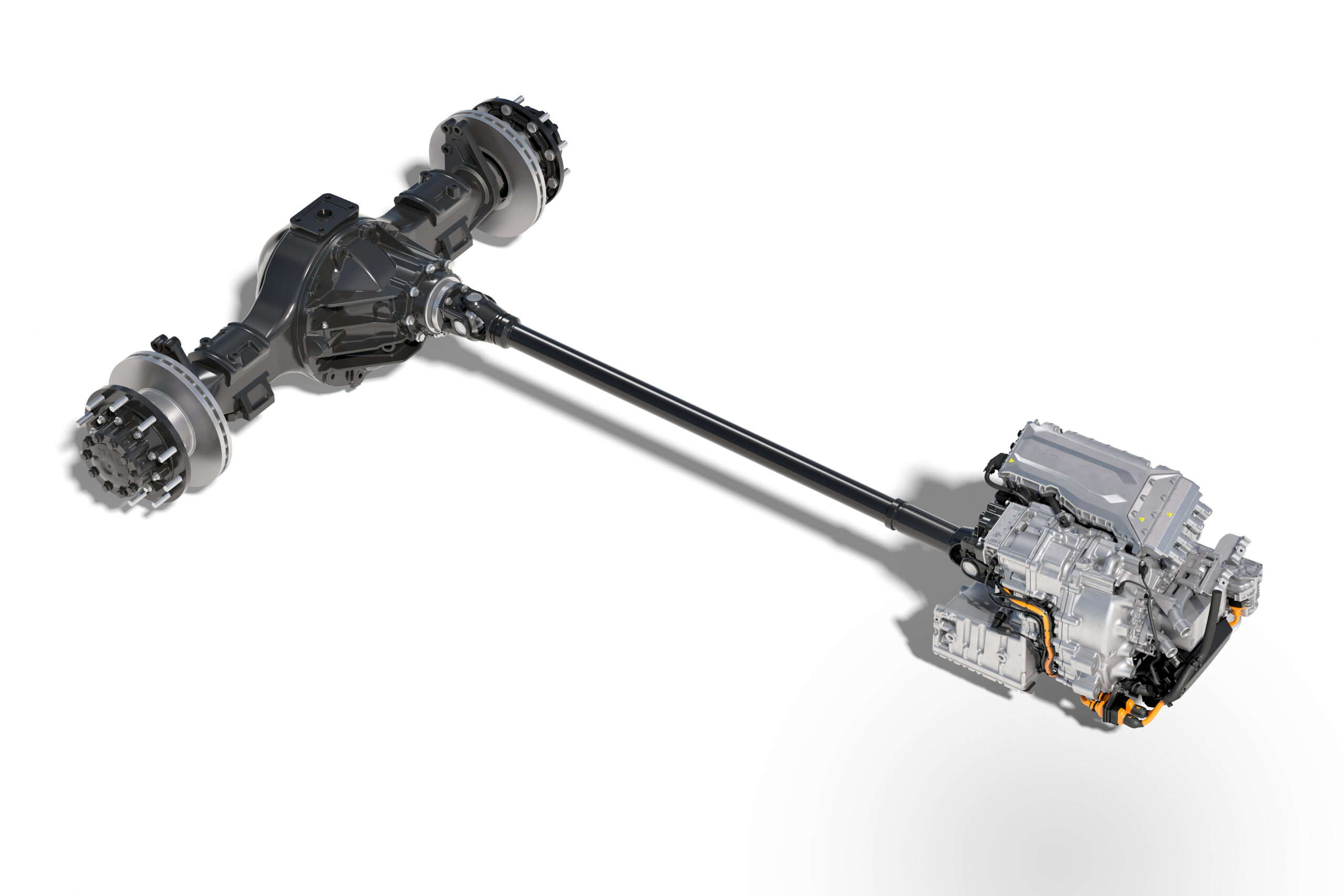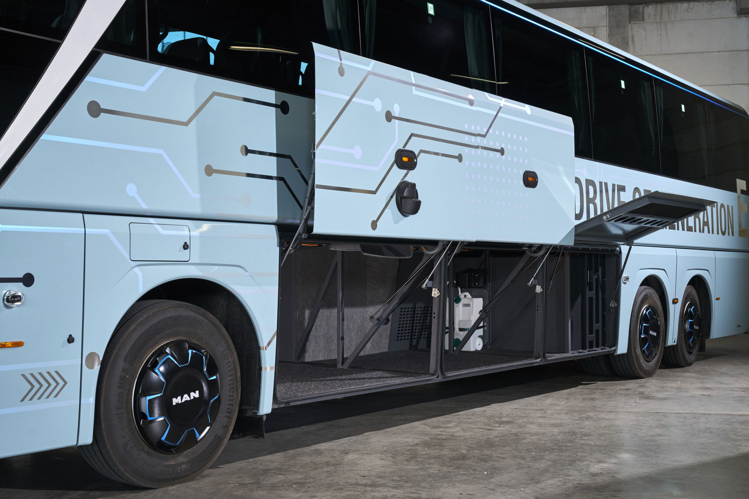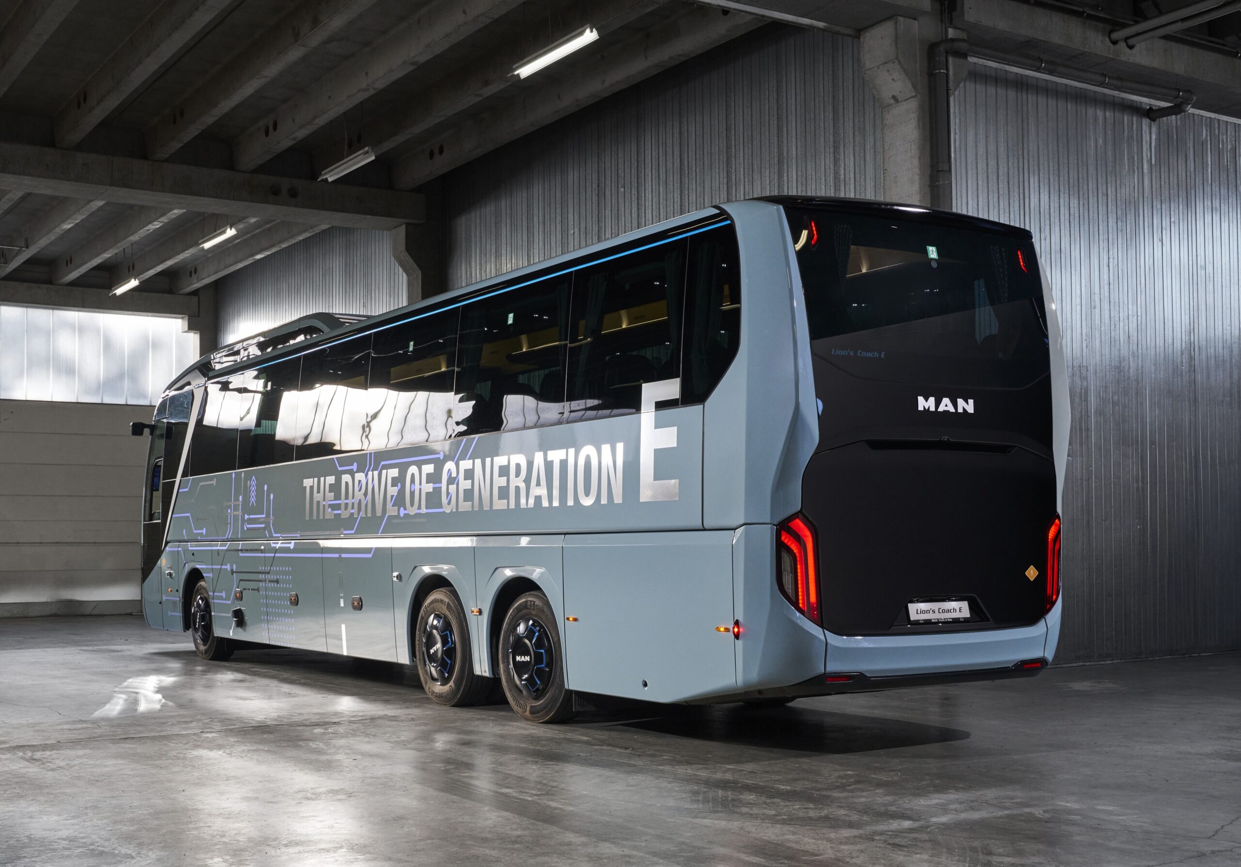 A hajtásrendszer terén az MAN a jól bevált műszaki alapokra épít, ugyanakkor kifejezetten a távolsági autóbuszokra jellemző igényekhez igazított megoldásokat alkalmaz. A Lion’s Coach E központi eleme az MAN saját fejlesztésű, az MAN eTGX sorozatban is bevált eCD330 szinkron villanymotorja, amely nagy teljesítményt és magas hatásfokot kínál. A motor a hátsó akkumulátorcsomag alatt, a jármű középvonalában kapott helyet T elrendezésben, jól védett és alulról könnyen hozzáférhető pozícióban, a hajtást pedig a hagyományos tengelydifferenciál közvetíti – ez az évtizedek óta bevált elrendezés robusztus és kompakt kialakítást tesz lehetővé. A kardántengely és a differenciálmű tehát a Lion’s Coach dízelmotoros változatából származik, új viszont az elektrohidraulikus kormányzású C-tengely.