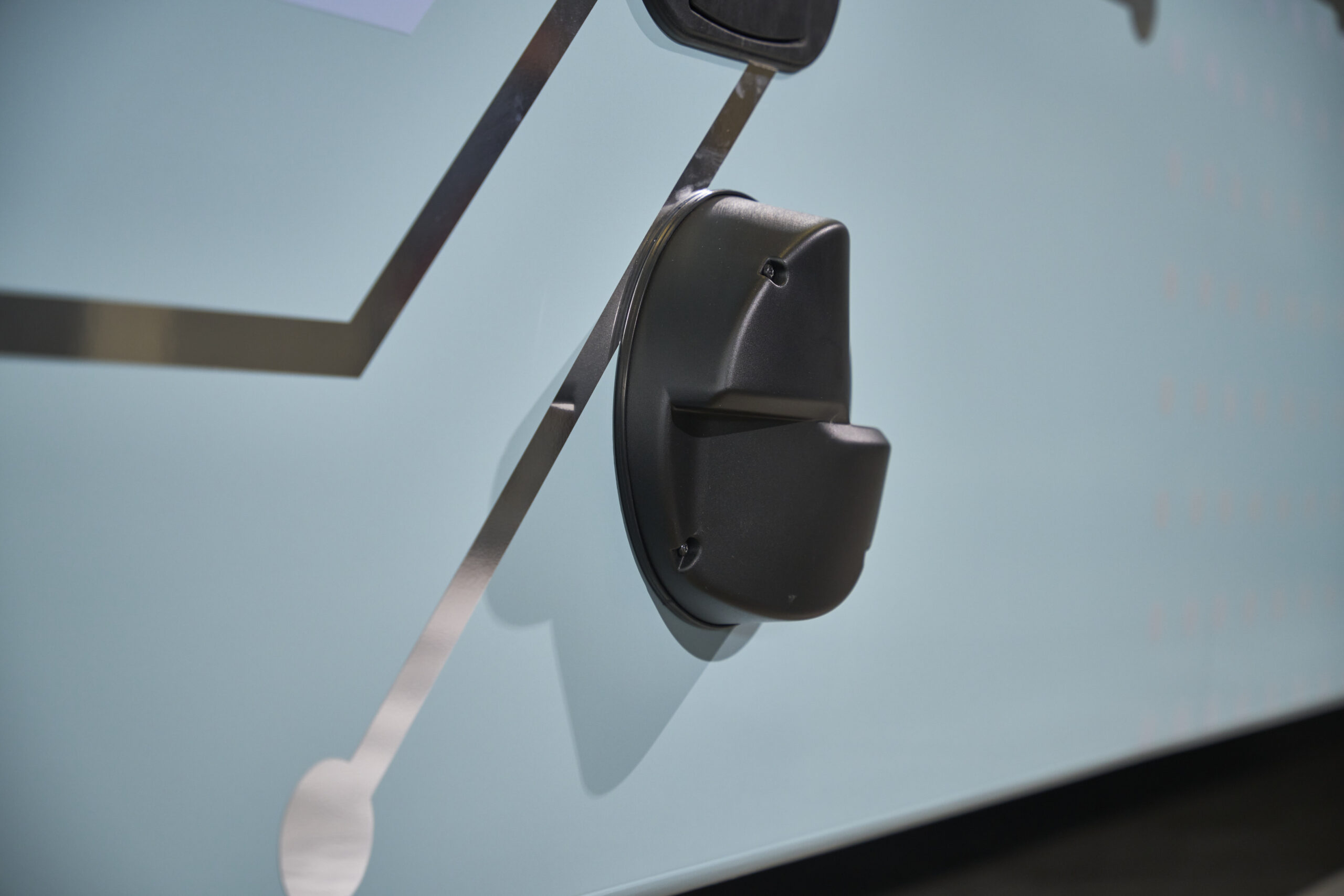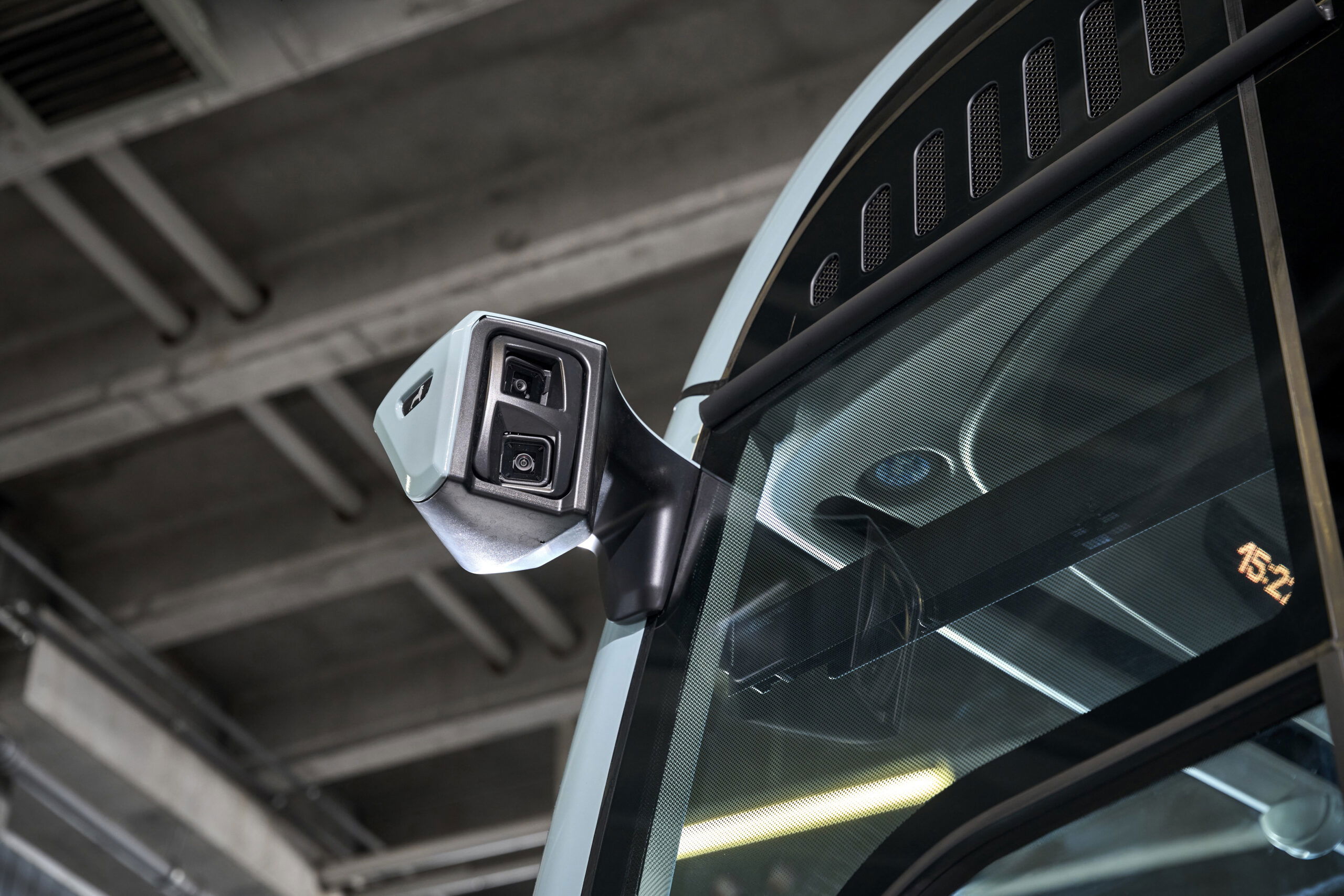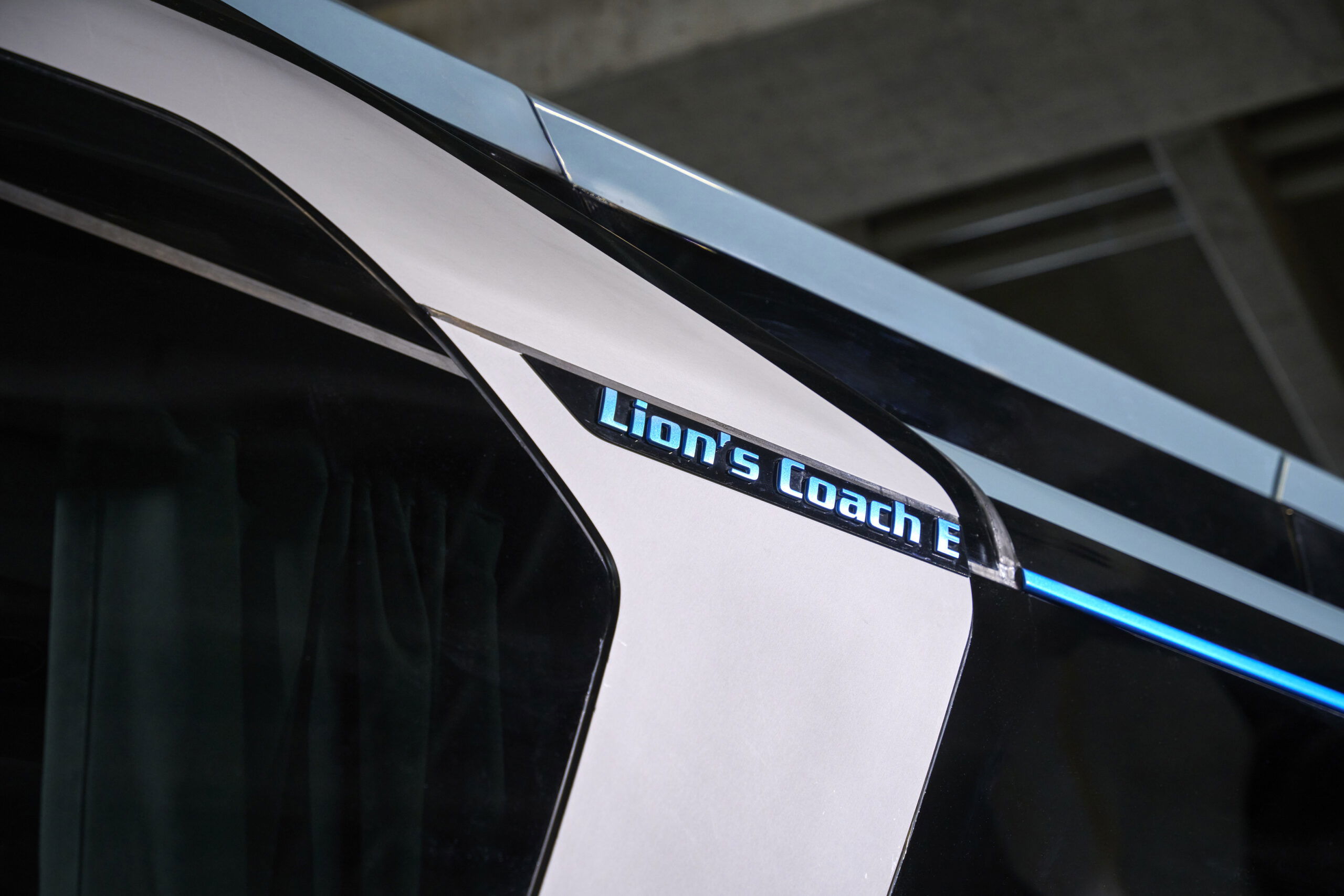 A B-oszlopnál elhelyezett, „blade” néven ismert alumínium idom is új értelmezést kapott: a korábbi íves lezárás helyett most merészen előrenyúlva csatlakozik a tetőperemhez, közvetlenül az „eHeadnote” felirathoz, amely már a Lion’s City E modelleken is megjelent 2019-ben. A „blade” felső része háromdimenziós kialakítású, mivel a CO₂ hűtő-fűtő rendszer burkolata karcsúbb lett, és a jármű középvonaláig hátranyúlik. Ez a megoldás térbeliséget és védőhatást kölcsönöz a tetőperemeknek, vizuálisan is erősítve a busz karakterét.