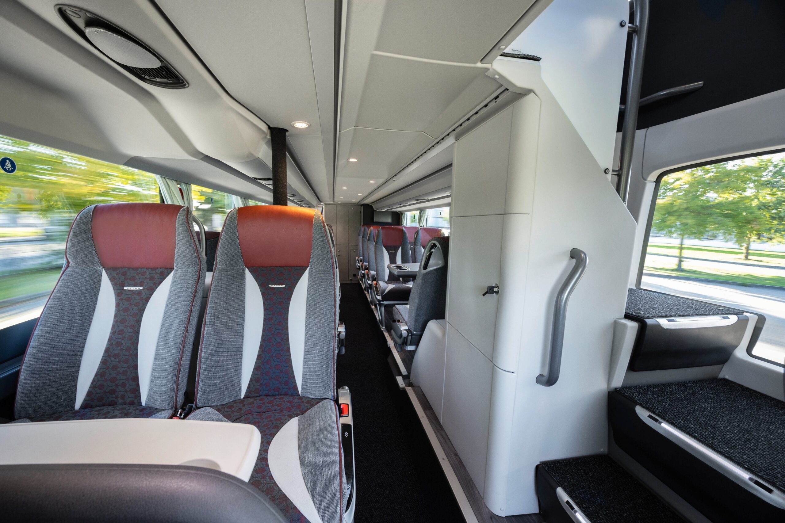 A belső tér tervezésénél a fő szempont a funkcionális elrendezés, a biztonságos mozgás és a könnyű karbantarthatóság volt. A két szintet összekötő lépcsők a karosszéria integrált szerkezeti elemei, külső oldaluk üvegezett, belső burkolatuk áttetsző akrilpanelből készült, amely természetes megvilágítást juttat az alsó szintre, és javítja a térérzetet. A belső burkolatok anyagválasztása a hosszú távú üzemeltetési követelményekhez igazodik, ugyanakkor a TopClass sorozatra jellemző, magas minőségű kidolgozással és precíz illesztésekkel készül. A világítás, a szellőzés és a burkolati elemek elrendezését karbantartási és higiéniai szempontok határozták meg, de az összkép így is igényes, prémium érzetű maradt, összhangban a típus kategóriájával.