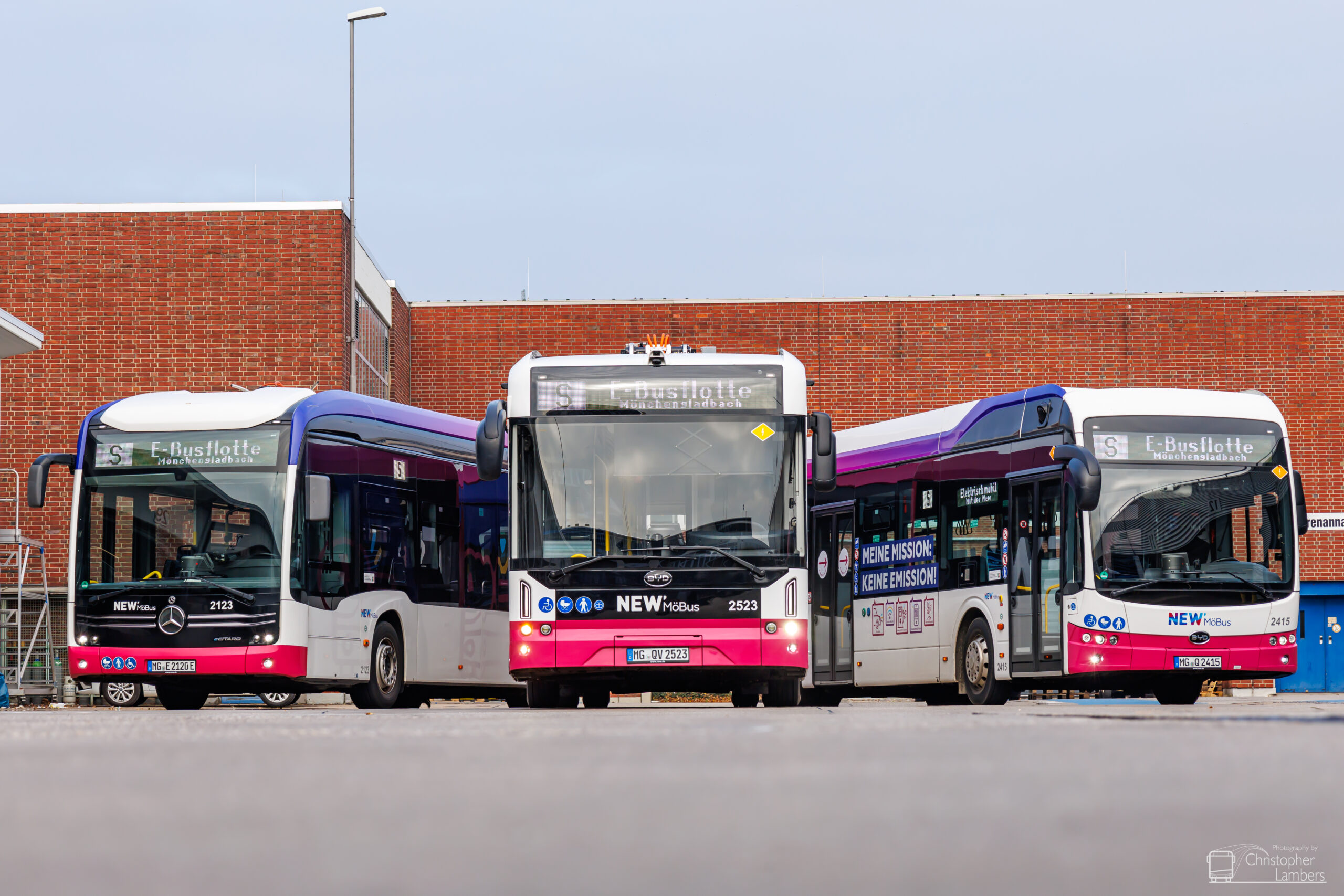 „Meine Mission: keine Emission!”, azaz magyarul: „Küldetésem a kibocsátásmentesség!” – olvasható az új elektromos BYD autóbuszok oldalán, amelyekkel a Mönchengladbach, valamint a vele szomszédos Viersen és környékének közösségi közlekedését biztosító NEW mobil újabb fontos lépést tesz egy korszerű, környezetbarát flotta létrehozása felé. A most érkezett járműveken a vállalatcsoport két szervezeti egysége, a Mönchengladbachban működő MöBus és a vierseni telephelyű NEW mobil und aktiv Viersen GmbH osztozik, előbbi állományát 30, utóbbiét négy új kocsi bővíti. Noha a BYD saját fejlesztésű, Blade Battery fantázianevű, padlóba integrált lítium-vasfoszfát (LFP) akkumulátorcsomagjával rendelkező B12.b típusból egy ideje már Németországban is futnak példányok – elsőként München elővárosában debütáltak –, a most forgalomba állított széria érdekessége, hogy ez volt a legelső európai megrendelések egyike, amelyet az újgenerációs változatra vett fel a gyártó. Az immár a BYD komáromi üzemében készült villanybuszok első öt példánya október 10-én állt forgalomba a NEW mobilhoz tartozó üzemeltetők által szóló járművekkel kiszolgált viszonylatokon. Azóta további három jármű csatlakozott a flottához, amelyek több mint tíz éves, dízelüzemű Mercedes-Benz és Solaris autóbuszokat váltanak ki. A fennmaradó kocsikon az utolsó simításokat végzik: jelenleg a különféle fedélzeti rendszerek, illetve az üzemeltetéshez szükséges egyéb berendezések beépítése zajlik. Az aktuális ütemezés szerint még az idén forgalomba állhat mind a 34 új villanybusz, míg a flottacsere 2026 első negyedévére várható következő szakaszában a tervek szerint további 11 darab szóló B12.b és 19 darab csuklós kivitelű BYD eBus B18 érkezik a NEW mobil rendelkezésére álló opciós keretből.