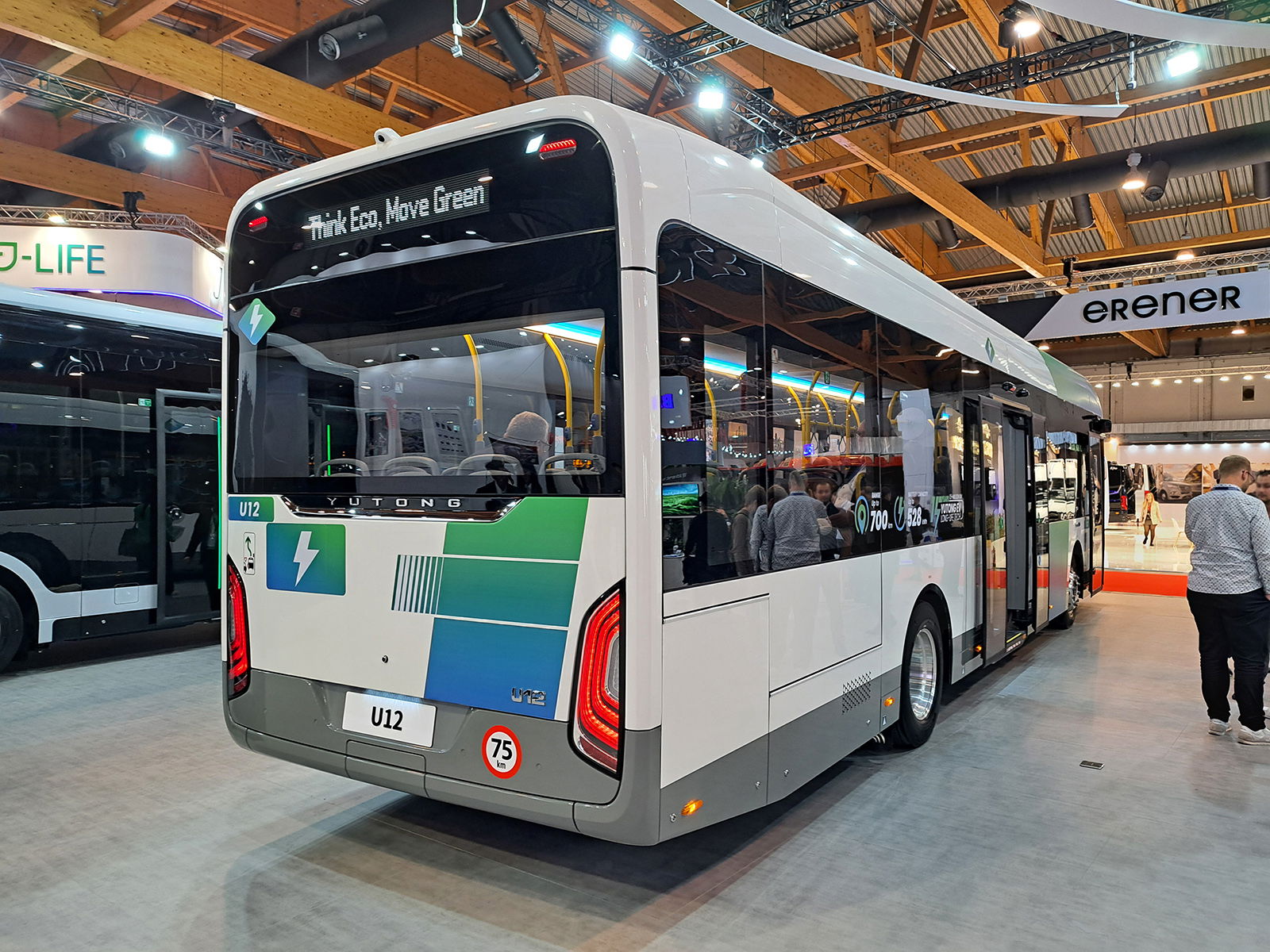 A prémium városi-elővárosi termékvonalként forgalmazott U-sorozatból idén két modellt is meg lehetett tekinteni a Yutong standján. A típuscsalád elsőként bemutatott tagja, a U12 szóló villanybusz éppen hat éve debütált ugyanitt, de az egyébként európai designerek által megrajzolt, időtálló formatervnek köszönhetően ez egyáltalán nem látszik rajta. Bár az újdonságok mellett ezúttal valamivel kevesebb figyelmet kapott a típus, az európai piacon egyre nagyobb népszerűségnek örvend, az U-széria tagjai pedig világszerte már 14 országban közlekednek, összesen több mint 41 millió teljesített kilométerrel a hátuk mögött. Az U12-esbe jelenleg 465 vagy 528 kWh összkapacitású lítium-vasfoszfát (LFP) akkumulátorcsomagot építenek, utóbbival a busz akár 700 kilométert is képes megtenni egyhuzamban a Yutong szerint, amely ezúttal egy elővárosi specifikációjú, 1-2-0 ajtóelrendezésű példányt hozott el a típusból a kiállításra.