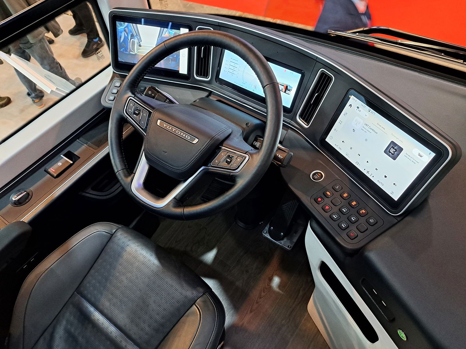 Az akár 61 ülőhellyel is felszerelhető utastér elegáns kivitelű és jó minőségérzetet kelt, akárcsak a vezetőkörnyezet. Itt a Yutong új, három LCD-kijelzőt felvonultató intelligens műszerfalát találjuk, amely a kellemest a hasznossal kombinálja: a gyakrabban igénybe vett funkciók, mint például az ajtóvezérlés vagy a műszerfalállítás fizikai gombbal működtethetők, míg a ritkábban használtak a jobb oldali érintőképernyőről, egy viszonylag jól átlátható menüből hívhatók elő. Ezt az új kezelőfelületet alapvetően az U-sorozatú villanybuszokhoz fejlesztette ki a Yutong (mindegyik kiállított példányba ez került), de átgondolt formája jól illeszkedik a helyközi típus burkolataihoz is.