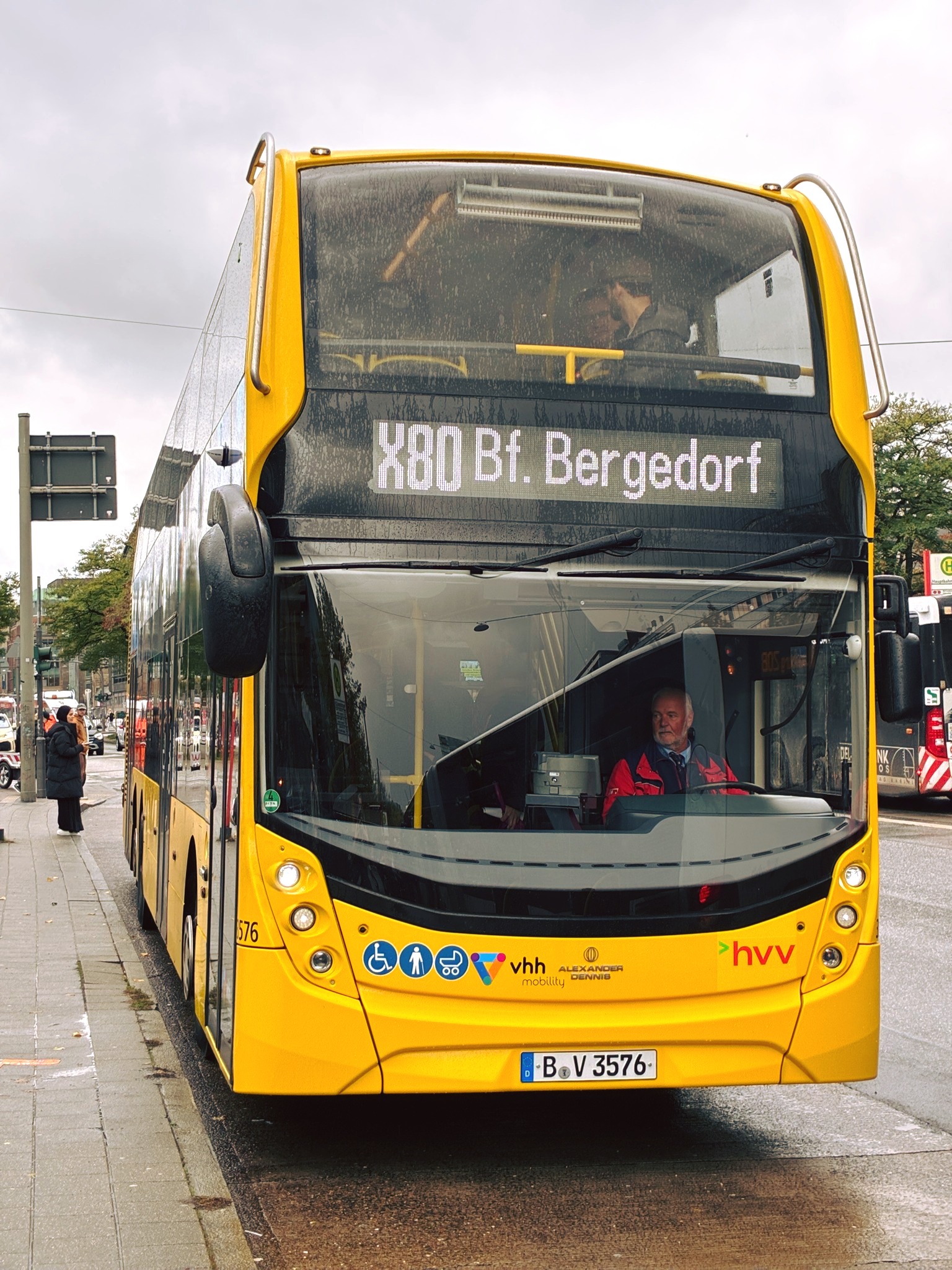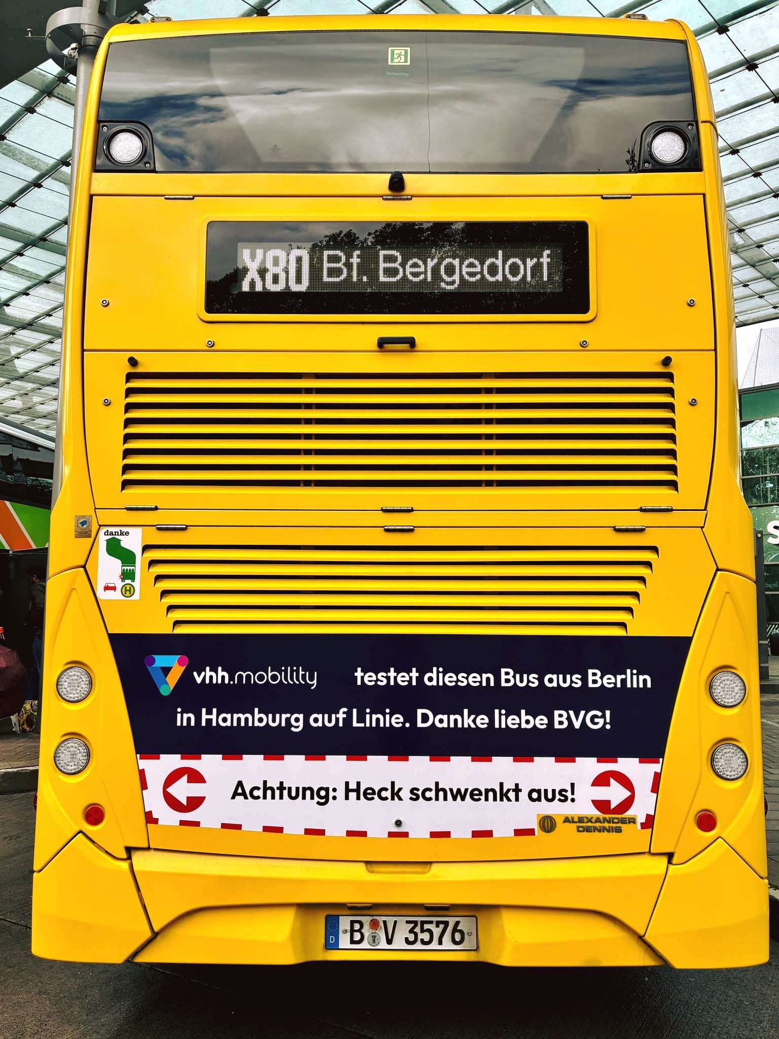 A Hamburg és térsége közösségi közlekedésének tervezéséért felelős szakmai körökben ugyanakkor ismét napirendre került annak vizsgálata, hogy hosszú idő után indokolt lehet-e a kétszintes autóbuszok visszatérése a városi és elővárosi hálózatra. A lehetőségek felméréséhez a VHH.Mobility egy dízelüzemű Enviro500-ast kért kölcsön Berlinből, abból a 200 darabos flottából, amelyet a BVG 2020 és 2023 között szerzett be a brit Alexander Dennis gyártótól. A Hamburgba érkezett, 3576-os üzemi számú autóbuszt a VHH ideiglenes arculati elemekkel látta el, és a tesztidőszakra külön promóciós dekorációt is kapott. A jobb oldalon elhelyezett „Berliner in Hamburg” felirat a jármű eredetére utalt, a bal oldali matrica pedig azt emelte ki, hogy az emeletes busz 50 panorámás ülőhelyet kínál „a legszebb város” kilátásával – természetesen a felső szintre utalva. A 13,8 méter hosszú és 4,06 méter magas típus összesen 80 ülőhellyel rendelkezik, és további 32 álló utast képes befogadni. A hátfalon elhelyezett kisebb matrica a BVG felé fejezte ki a hamburgi szolgáltató köszönetét a jármű rendelkezésre bocsátásáért. A buszt az X80-as expresszjáraton állították forgalomba, amely a hamburgi központi autóbusz-állomás (ZOB) és Bergedorf között közlekedik. A két hétig tartó próbaüzem 2025. október 29. és november 12. között zajlott.