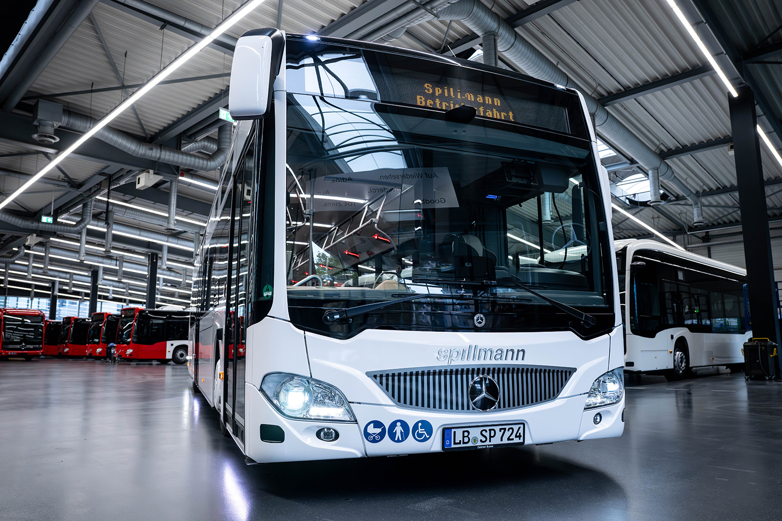 Az Omnibusverkehr Spillmann legújabb különleges járművét Bülent Menekse ügyvezető igazgató vette át október végén a Daimler Buses mannheimi gyárában, aki a busz tematikus stílusvilágának megalkotásában is főszerepet vállalt a Mercedes-Benz autóbuszos részlegének designerei mellett. A hófehér fényezésű, 2-2-0 ajtókiosztású jármű már kívülről is feltűnő jelenség: a frontrészt krómhatású hűtőrács-imitáció, míg a hátfalat a klasszikus limuzinok jellegzetes részletének számító bumerángantenna rajza díszíti. A busz a típusra jellemző hullámos helyett optikailag egyenes övvonalat kapott, a szintén fólizással „lejjebb hozott” tetőhosszsarok pedig keskenyíti az ablaksávot, ami az alkotók elgondolása szerint hosszabbnak, alacsonyabbnak és a krónutánzatú keretnek köszönhetően exkluzívabbnak láttatja a járművet.